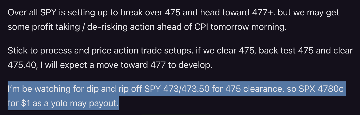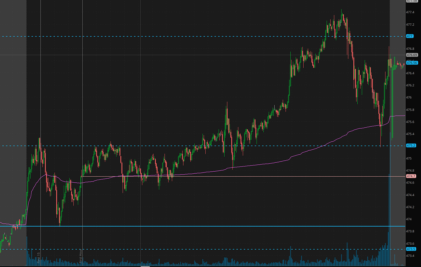 And guess what, It played out EXACTLY like I predicted. In premarket we got the 473.50 dip, then during first hour we back tested the r/g line culminating in a breakout over 475. Notice how I said look for the backtest on 475 to come and clear 475.40. There was a little fight/chop there, but once it did, it gave us the 477+ move!