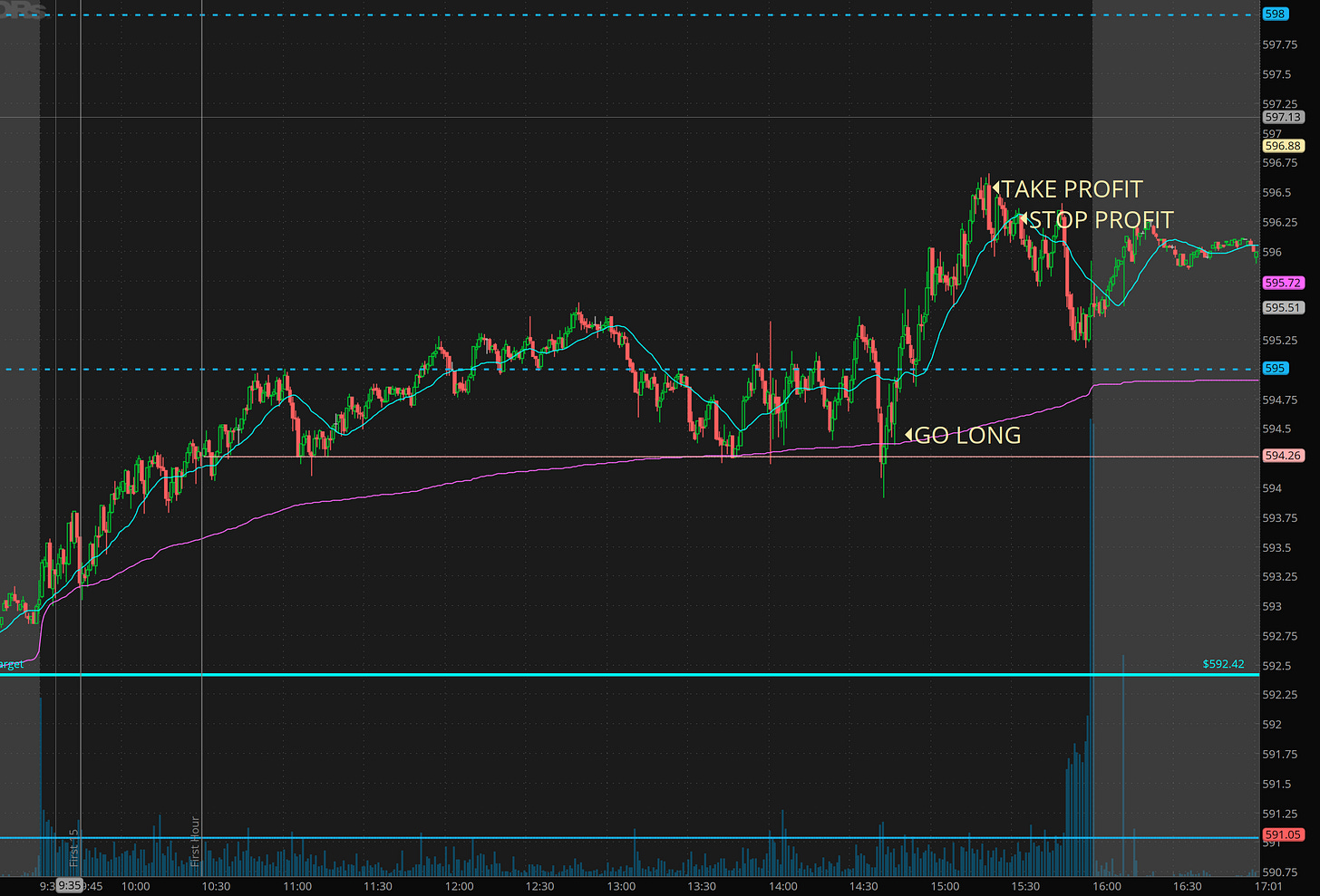 Not much to really explain except you can see how powerful the failed break down signal is. We cleared highs and pushed to 596.50.