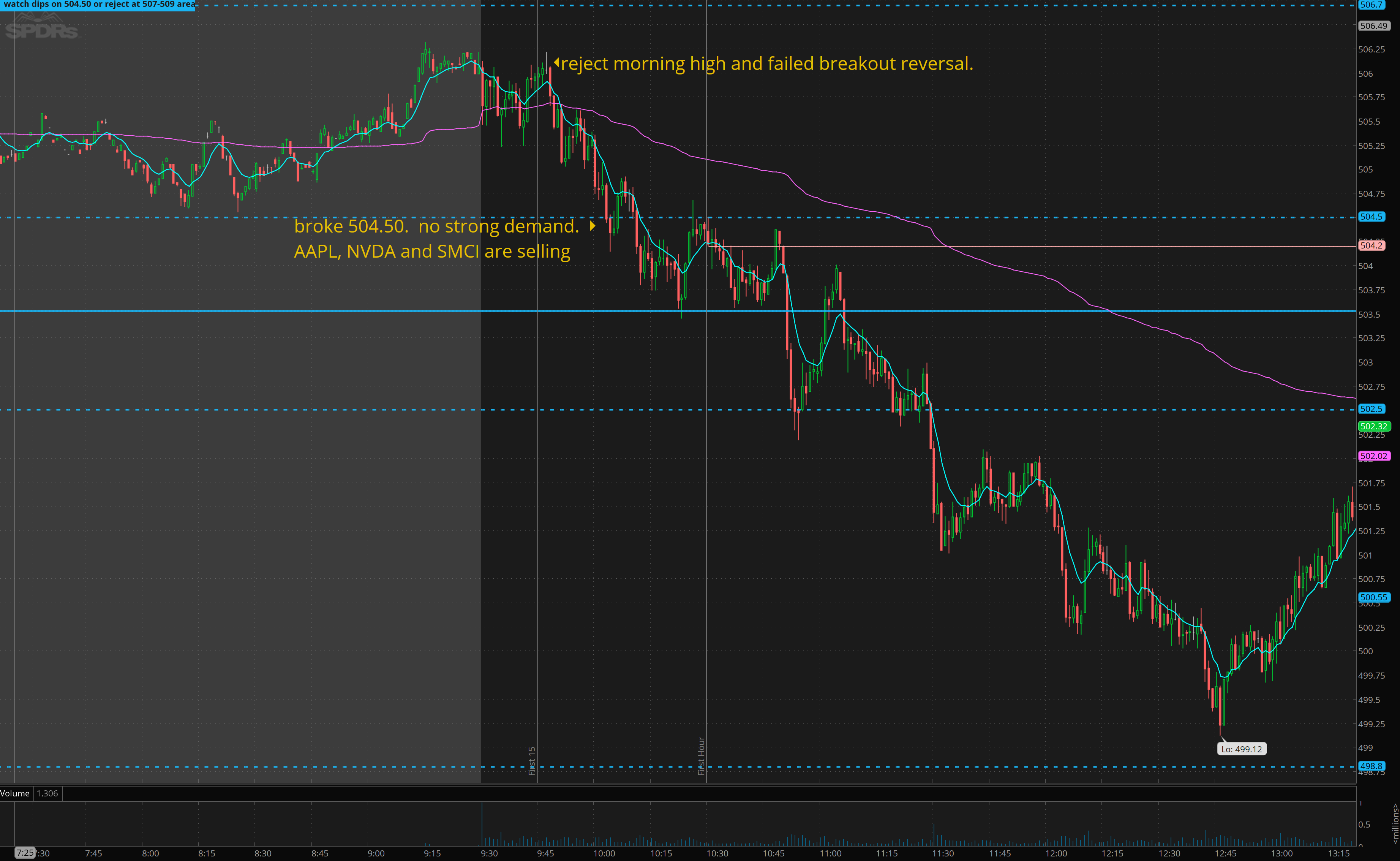 You can see how we had a fail push reversal on premarket highs, and then we borke premarket support. Those 2 combine together triggered the downside plan. we then count 2 levels below and and the target under 503 break becomes 498.80. WE got to 499.12!