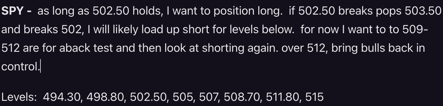 Overall focus will be on bull puts on SPY and possible yolo calls. I will cut all calls if SPY break 502.50 again and likely scale in on next failed pop with size short.