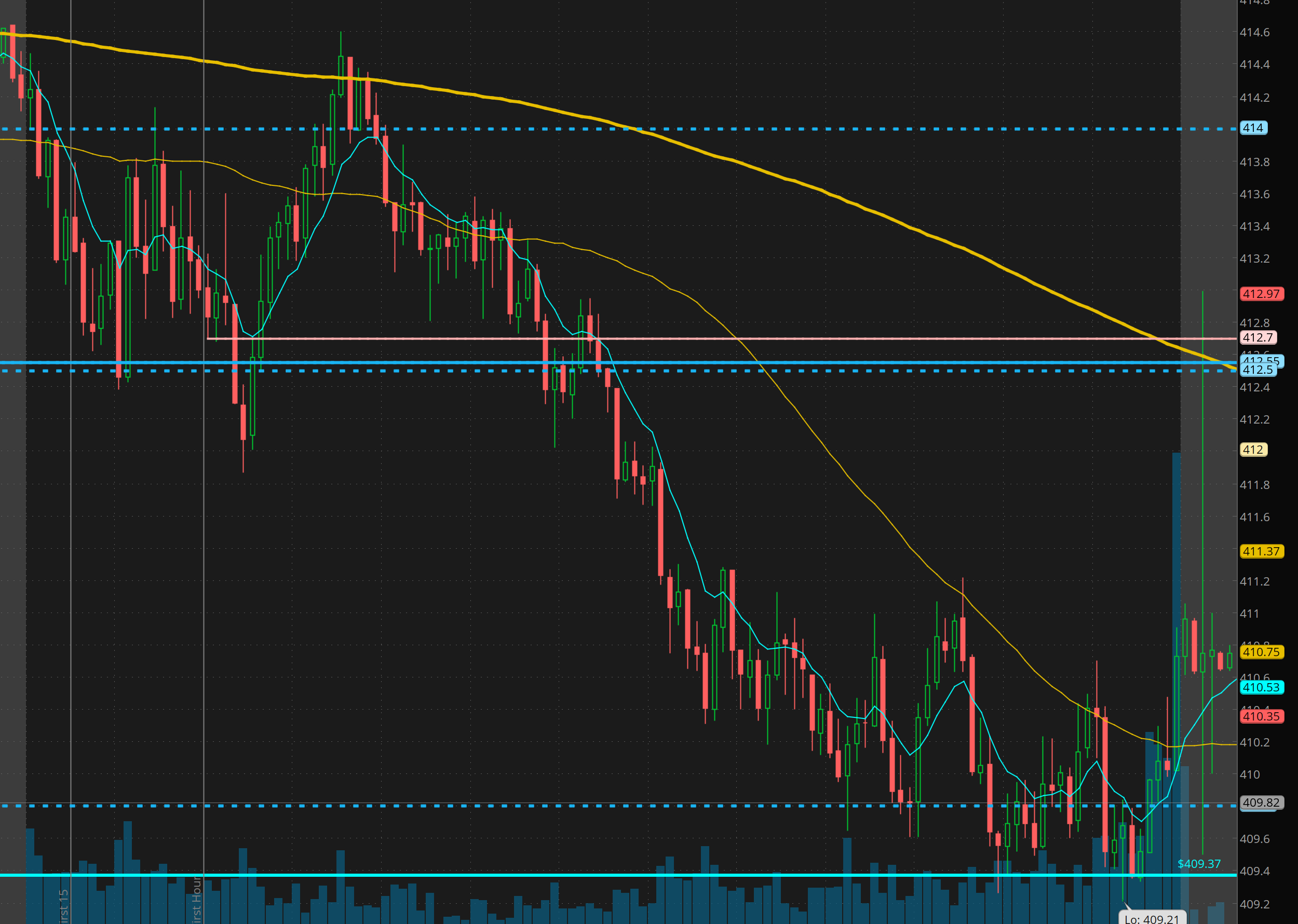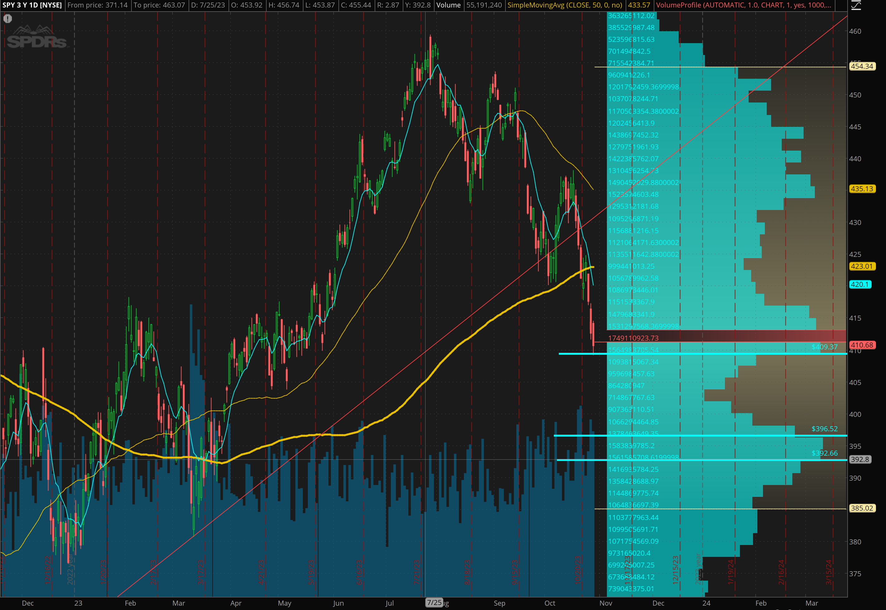 See the volume gap between 409 and 396. If we break 409 this coming week, we could see 396 within 2 weeks. I was looking for one more back test of 425 or 418 before hitting 409 but we are here. I’ll be hawking on pops or on a close under 409 to reopen a short swing targeting 395. Ideally 410 holds and we get that 418+ bounce to reload short.