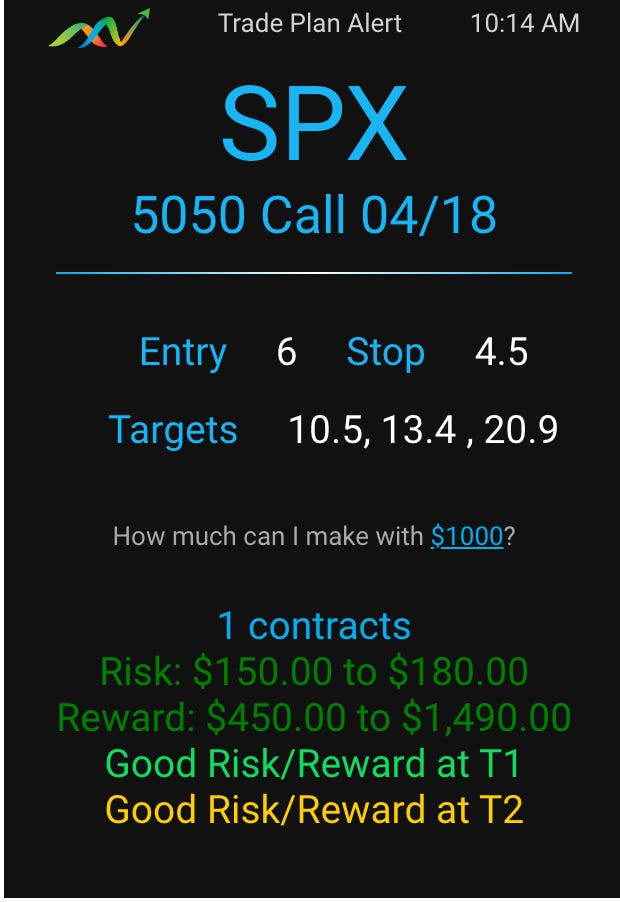 Apr 18 - SPX 5050c - Entry $6 ($6000→$16000 potential)