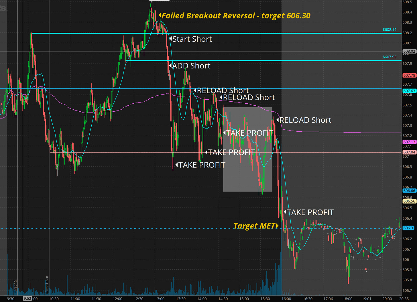 SPY - back test 605.80 overnight. That was the level I want to reload long but we are pushing back on 607s and tested 608