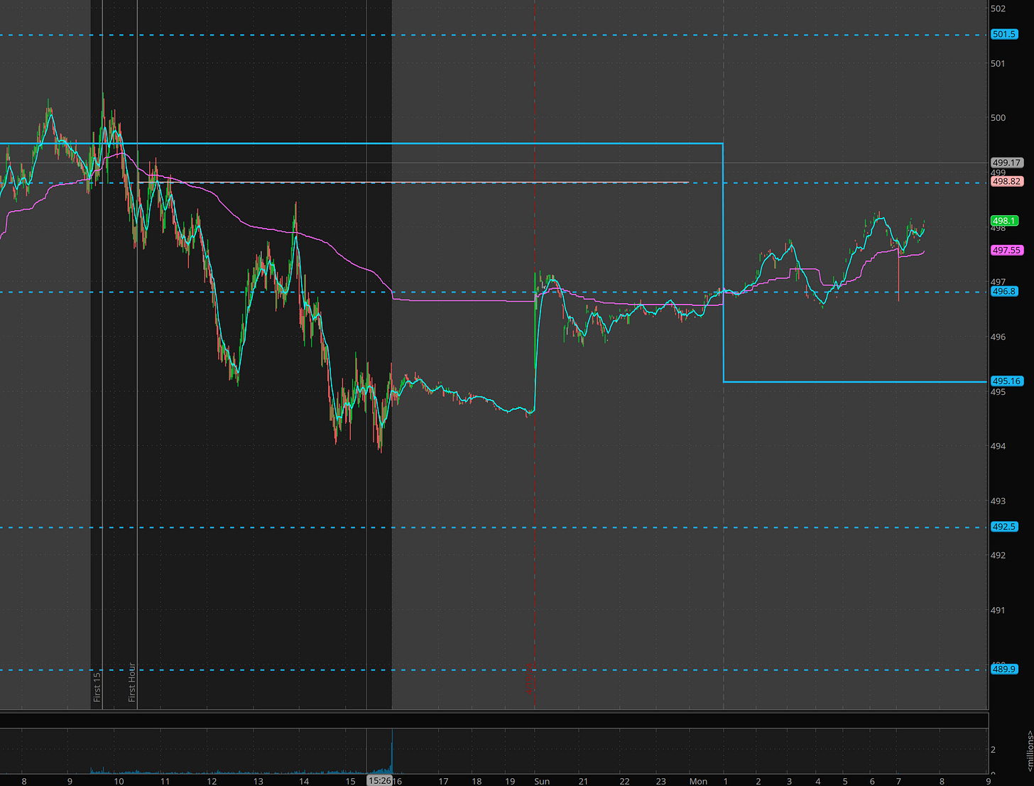 Eventually SPY got tot he 494-495 zone I talked about last week as being a gap fill on the daily chart. In theory we gap up and clear 500.50 today for a move toward 505.