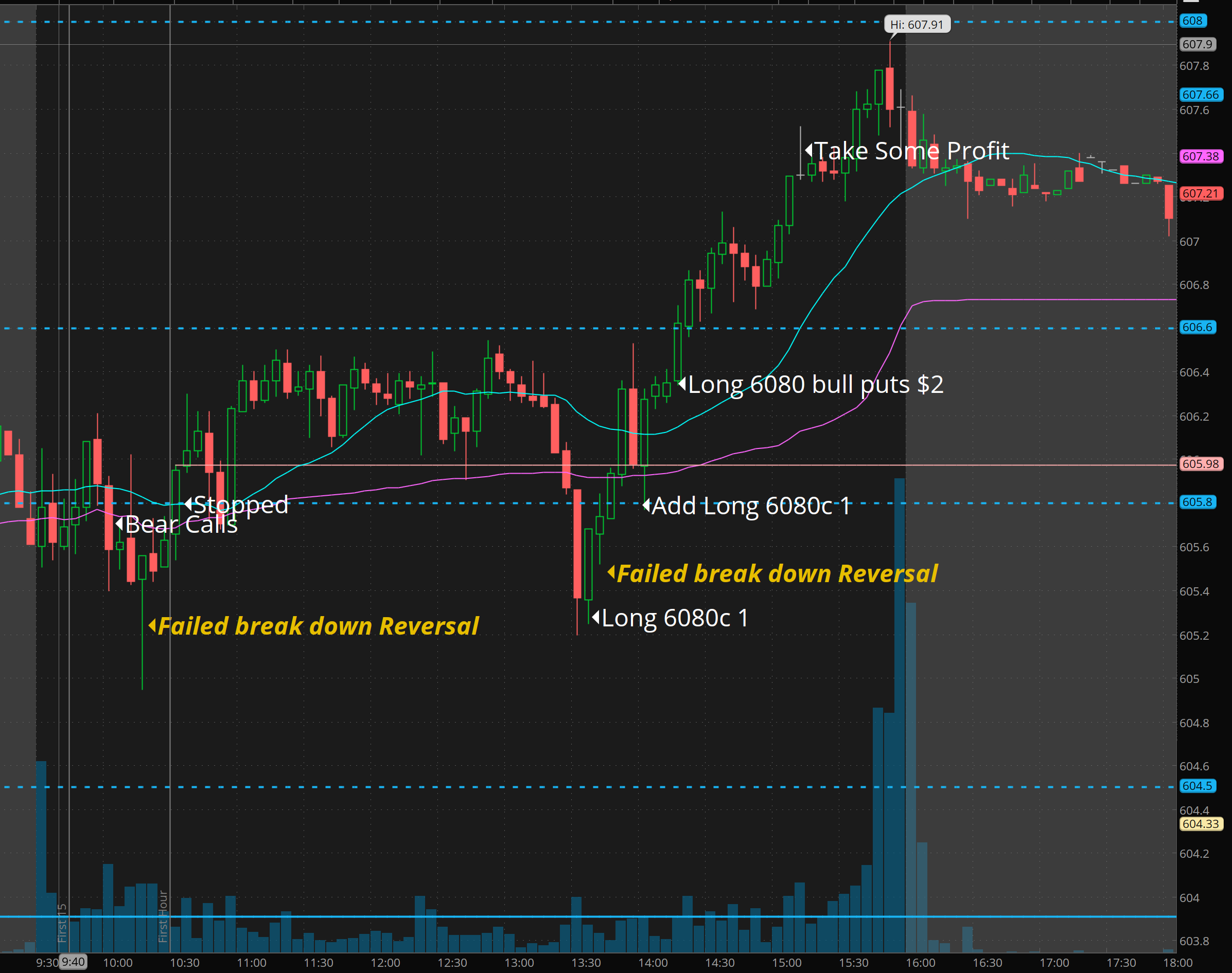I followed process for gap up reversal and initially went short, but when 605.80 reclaimed. Flipped long! Again being systematic. I don’t have to be right on direction, I have to be able to extract profit. I don’t care about losing on a trade, many times the flip can pay more!