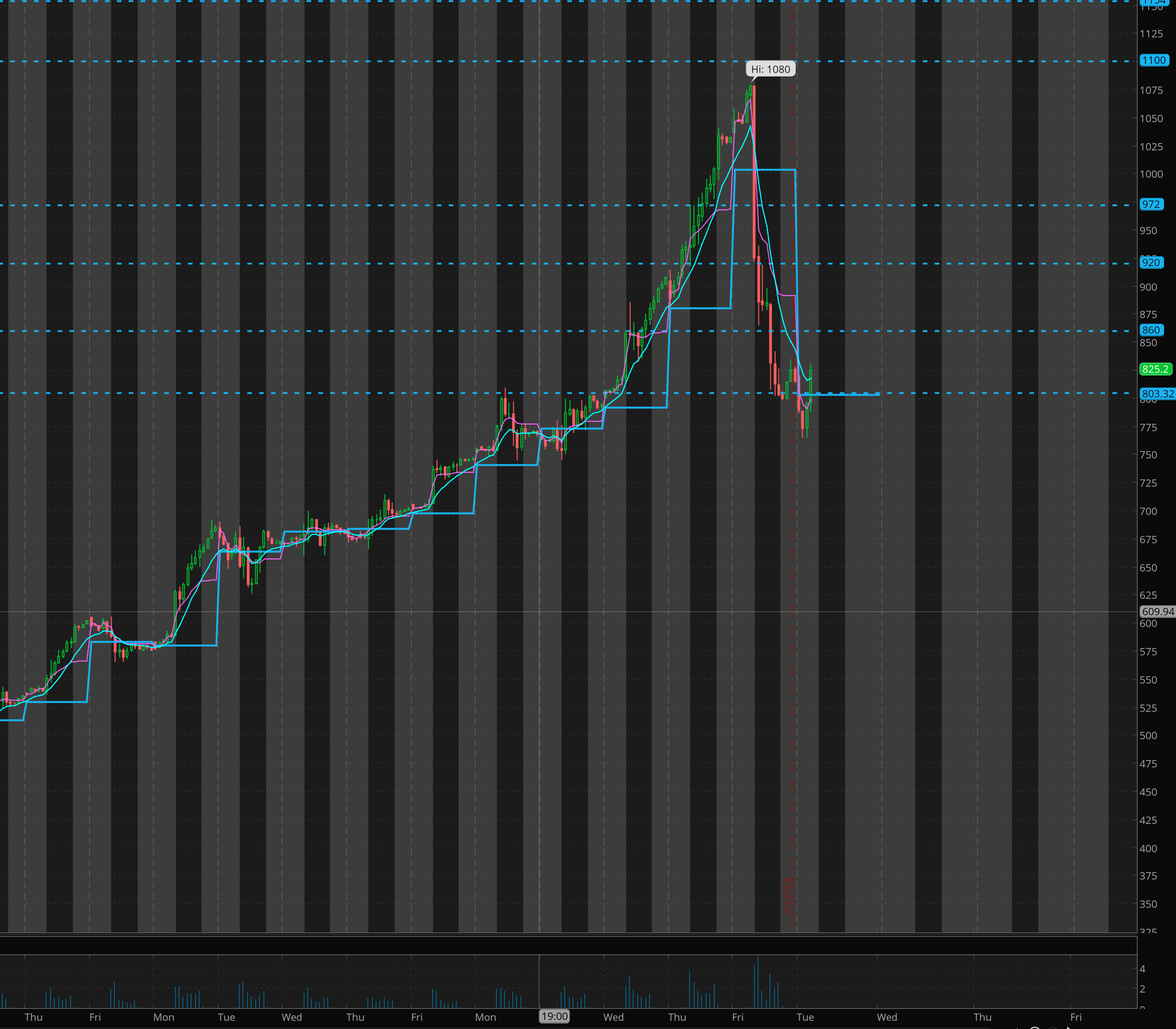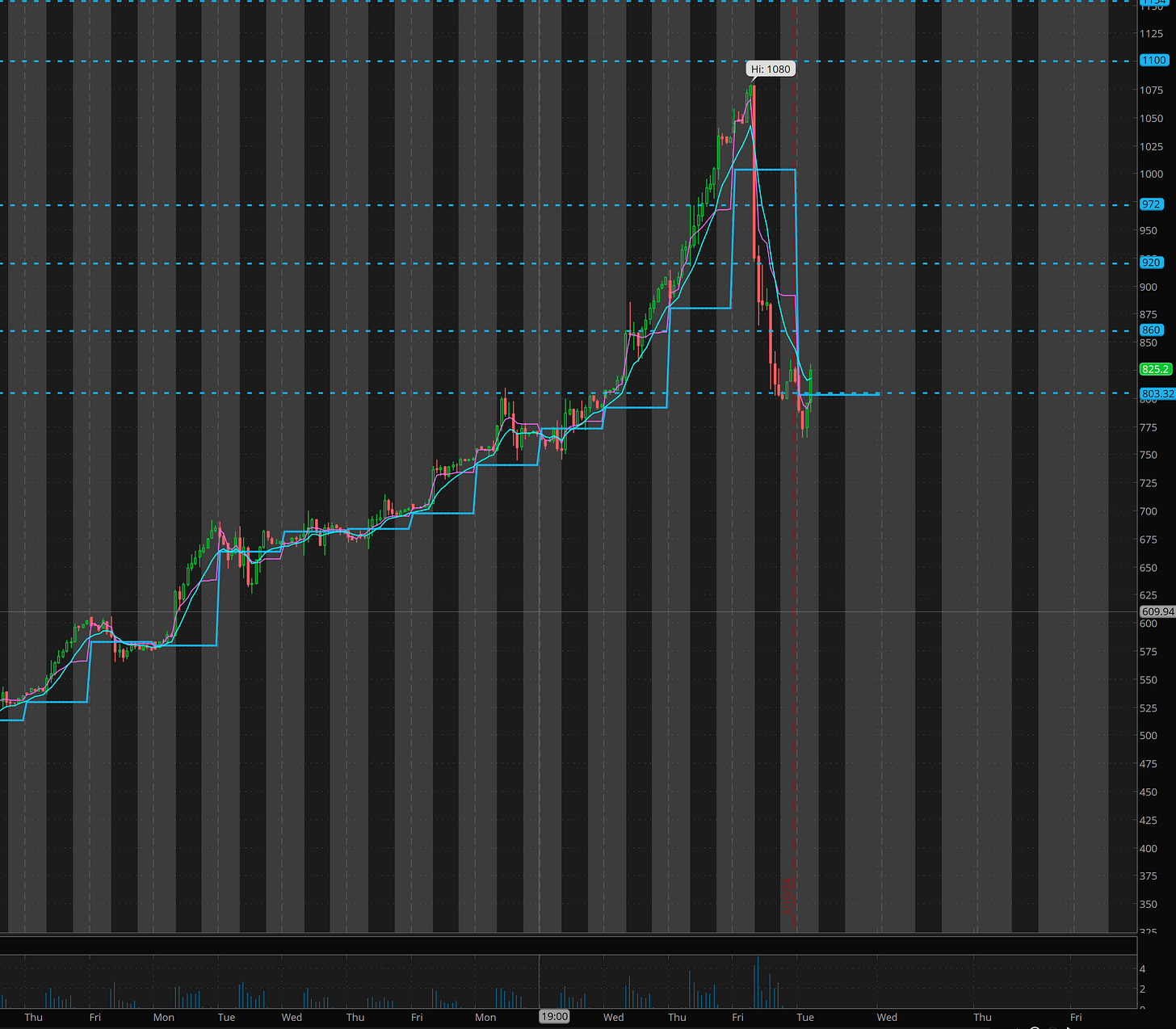 If you missed the first opportunity, many times, on this exhaustion type of move, there is a second drop and great money to be made there too. I was trying to get the 900p for $1 but SMCI couldn’t get even get over 900. So then I switched focus to SMCI 850p for $1 and started in at $3 and also took some 800p for 0.50 since I knew that would likely get juiced on a drop.