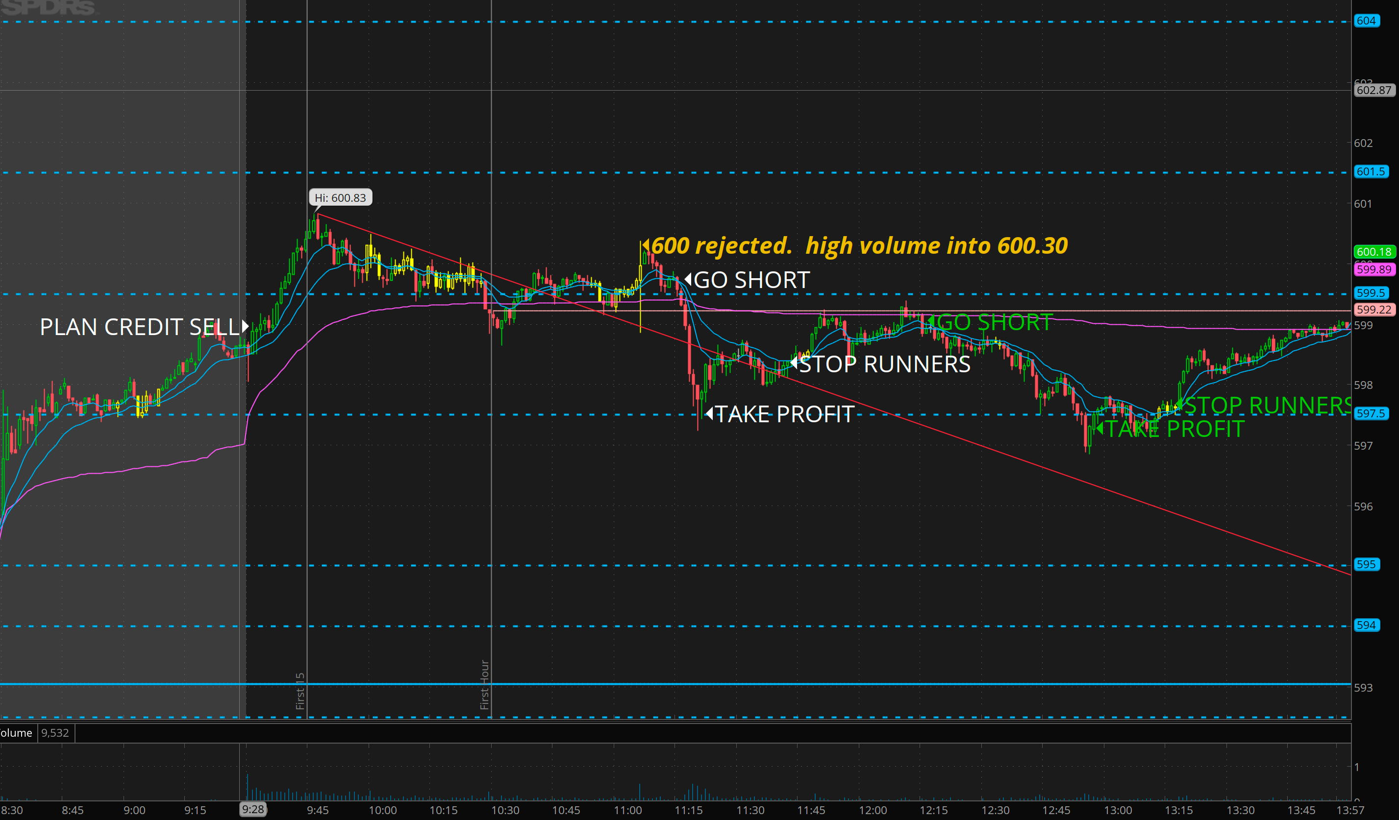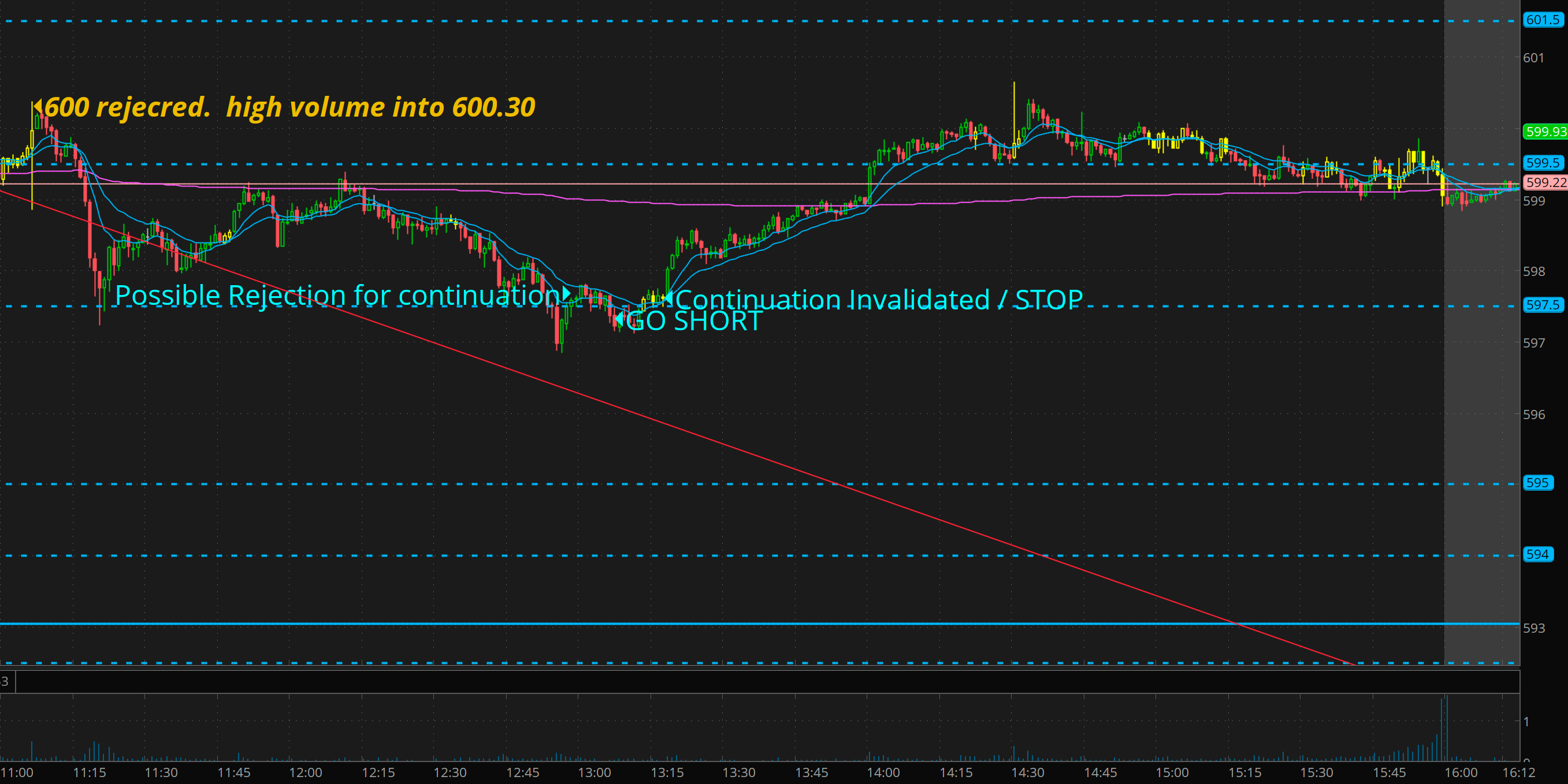 The only place to consider short on Friday was at the 599.50 break or at the vwap rejection. Chasing at support can work but this is where timing comes in. I tend to avoid opening trades from 12 to 1pm. I tried to get back home by 1pm on Friday from my errands, but no dice.