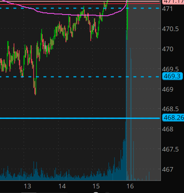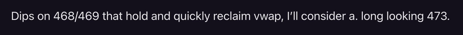 Yesterday I planned out 3 or 4 scenarios. One was for a 469 dip and vwap reclaim triggering a move to 473. The key reason was that per premarket prep, as long as we don’t close under 468, the strong upward trend is intact. we basically back tested the 9ma on the daily. BTFD is still the name of the game.
