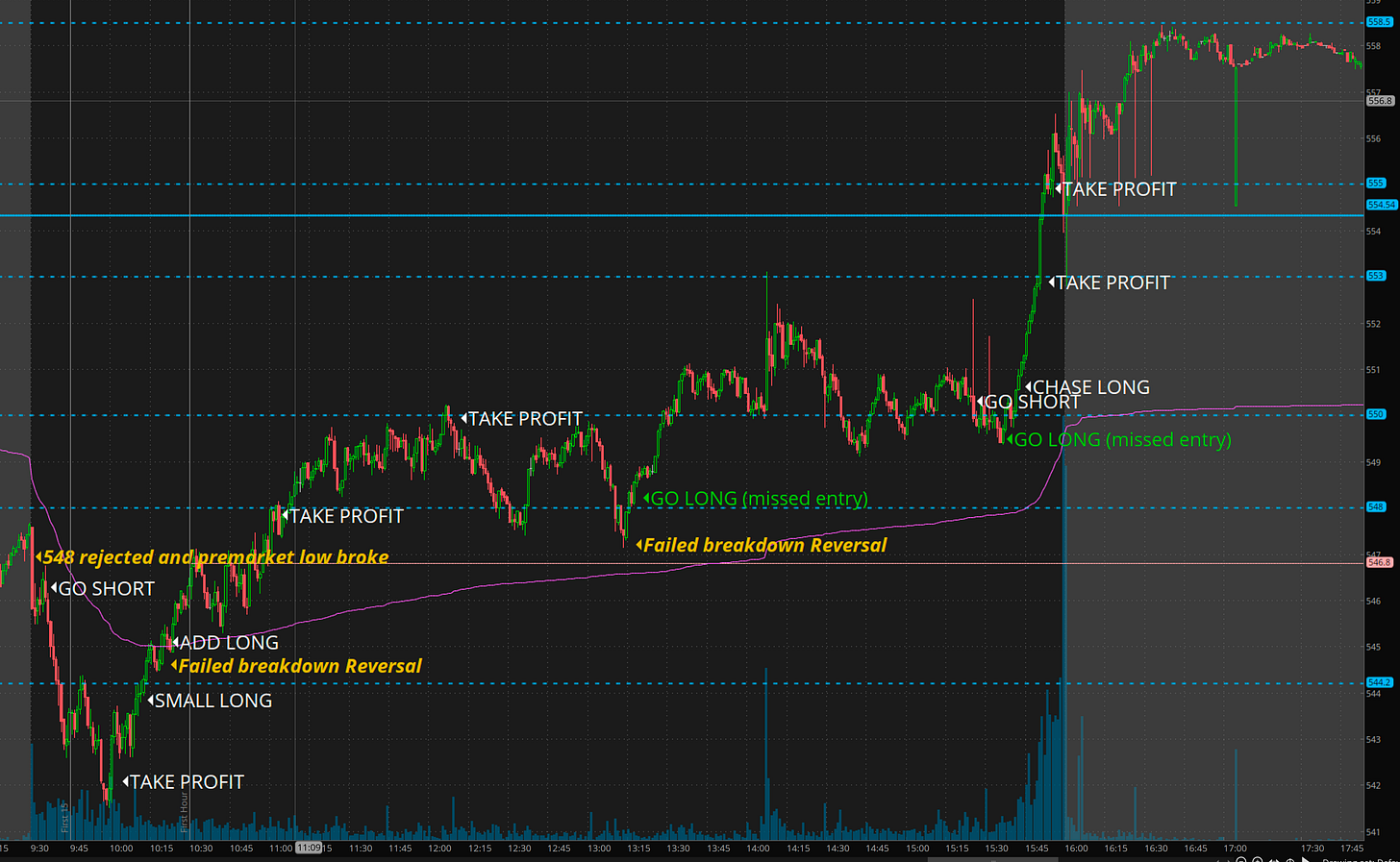 We took short based on opening action, but the trend exhausted quickly. After the first hour it became clear we could have a failed breakdown reversal on hour hands. The big unknow was what will happen at 548 and 550. Sow we take procifts. We then had consolidation for a few hours. Notice the failed breakdown during lunch. I was away and missed my dip buy reload order from getting filled by $2-3 :(