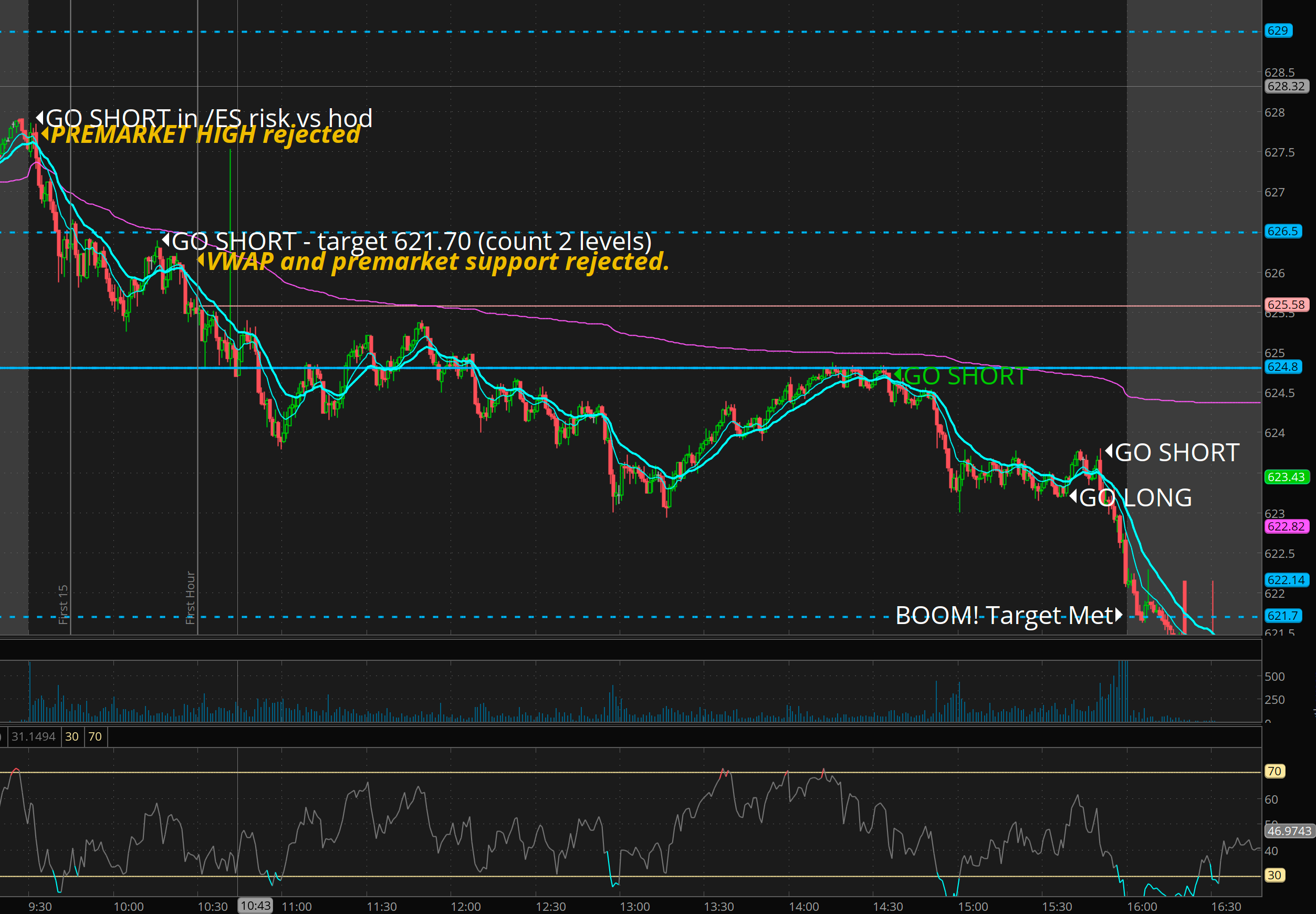 This was a little bit of a challenge. I really wanted 629 or 631 to get short. but a bug in me said, why not short using /ES vs the highs. its like 5 points of risk and 15-40 points of opportunity. Turned out to be 65 points!