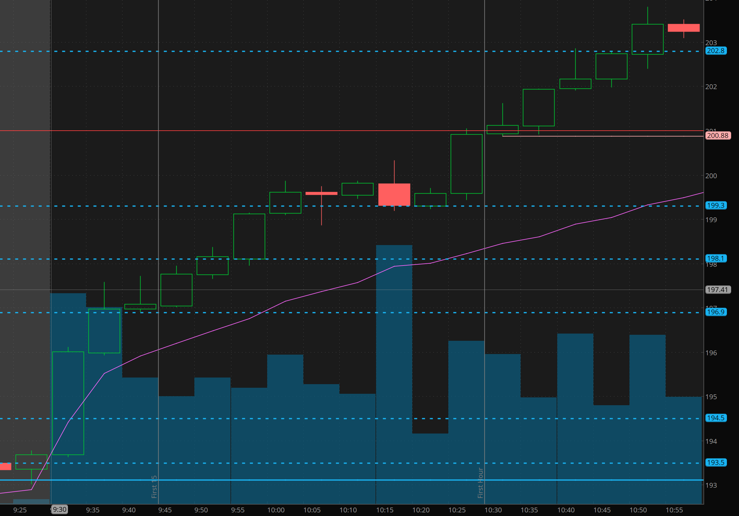 You can see and market blew past 194.50 with volume at the open and ever dip was getting bought. At this point I decided that we should at least test 198 and if that clears we are going to 202.80 and possibly 210+ into next week as AAPL could breakout on the daily chart. Using the levels as a guide I alerted taking 200c and 205c for an extra week out as swing trades.