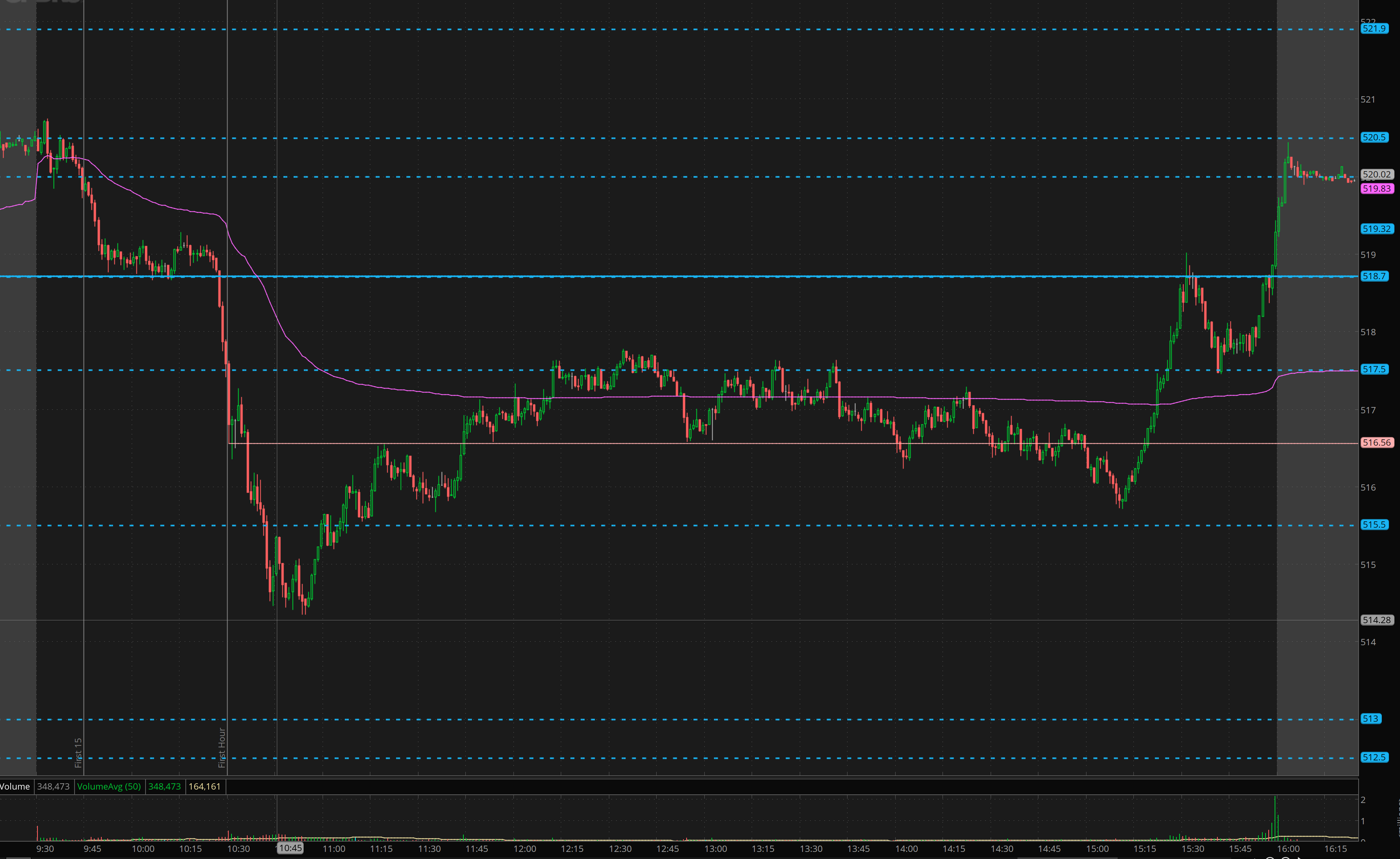 Remember how I talked about being wrong. I was initially looking for a dip and rip off the 519 level, but when it broke I have a rule. When wrong, flip with double the size. sell 50% at double of any losses and ride the rest to targets. In this case, I never went long, but I did jump in with size.