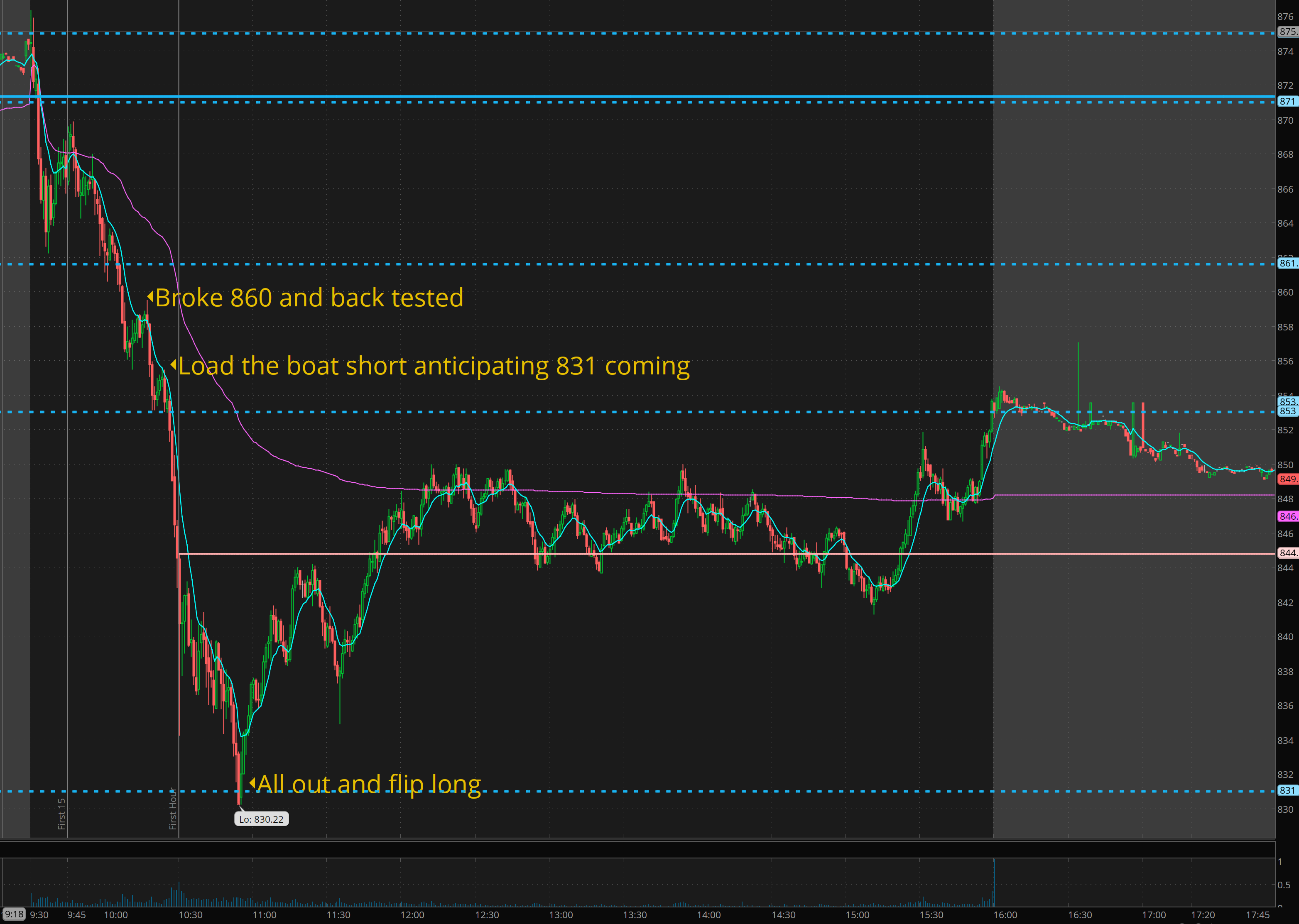 Another good example of an idea being wrong but having plan b ready. Yesterday I wrote I was looking for a dip and rip off 860, but if we get into 853-858 I want to short targeting 831. Guess what happened.