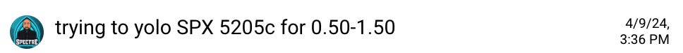 Apr 9 - SPX 5205c - Entry $0.50 ($500→ $6000)