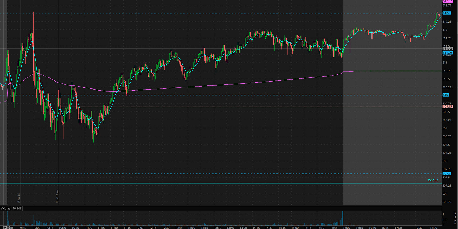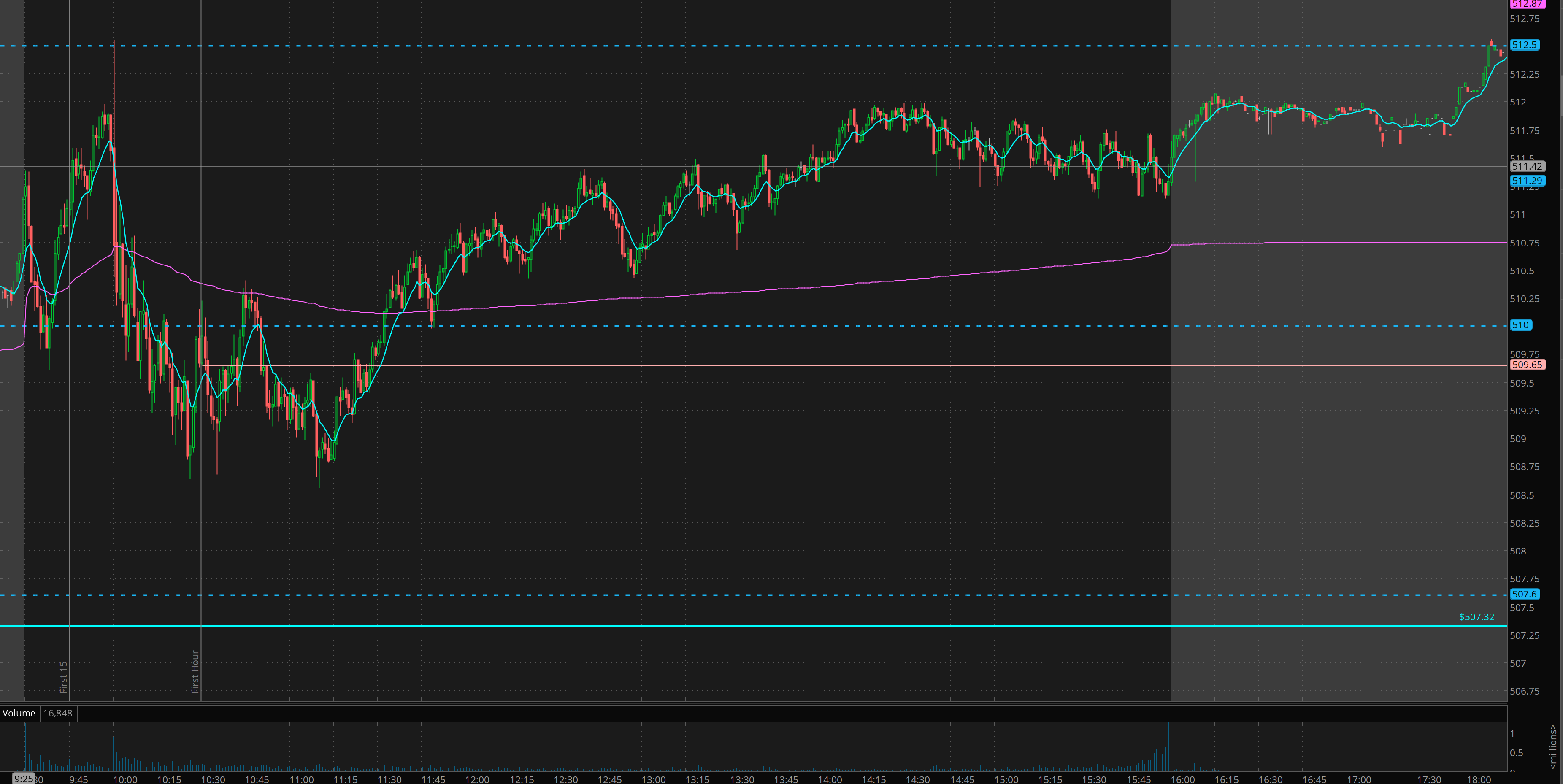 At this point bull puts could be taken, especially after the recalim of the peach line at 509.65. They key to recognizing this is to wait for the first hour to complete, then look for a double bottom/ failed breakdown on the second dip. The reclaim of the 409.65 level was simply the confirmation. One can then take 510c targeting 512.50.