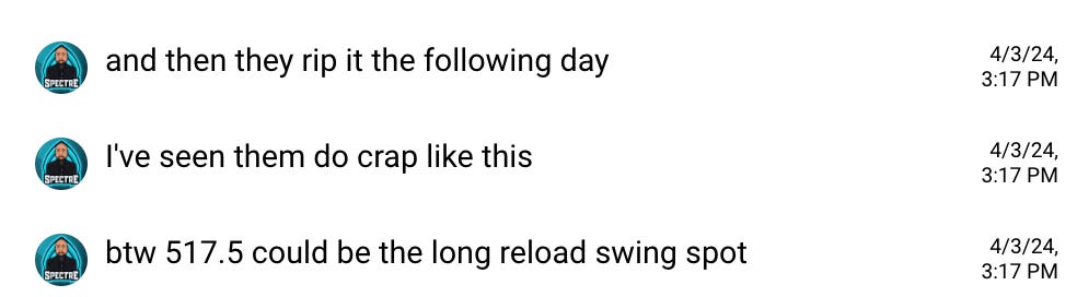 Finally the SPY flushed back into 518. I looked for a short in case of trend join. I was more than happy to risk $2 on small size and be wrong (I had made $4 with size on first drop). Why? If I was wrong and another sell leg developed, the payout would have been 5x.