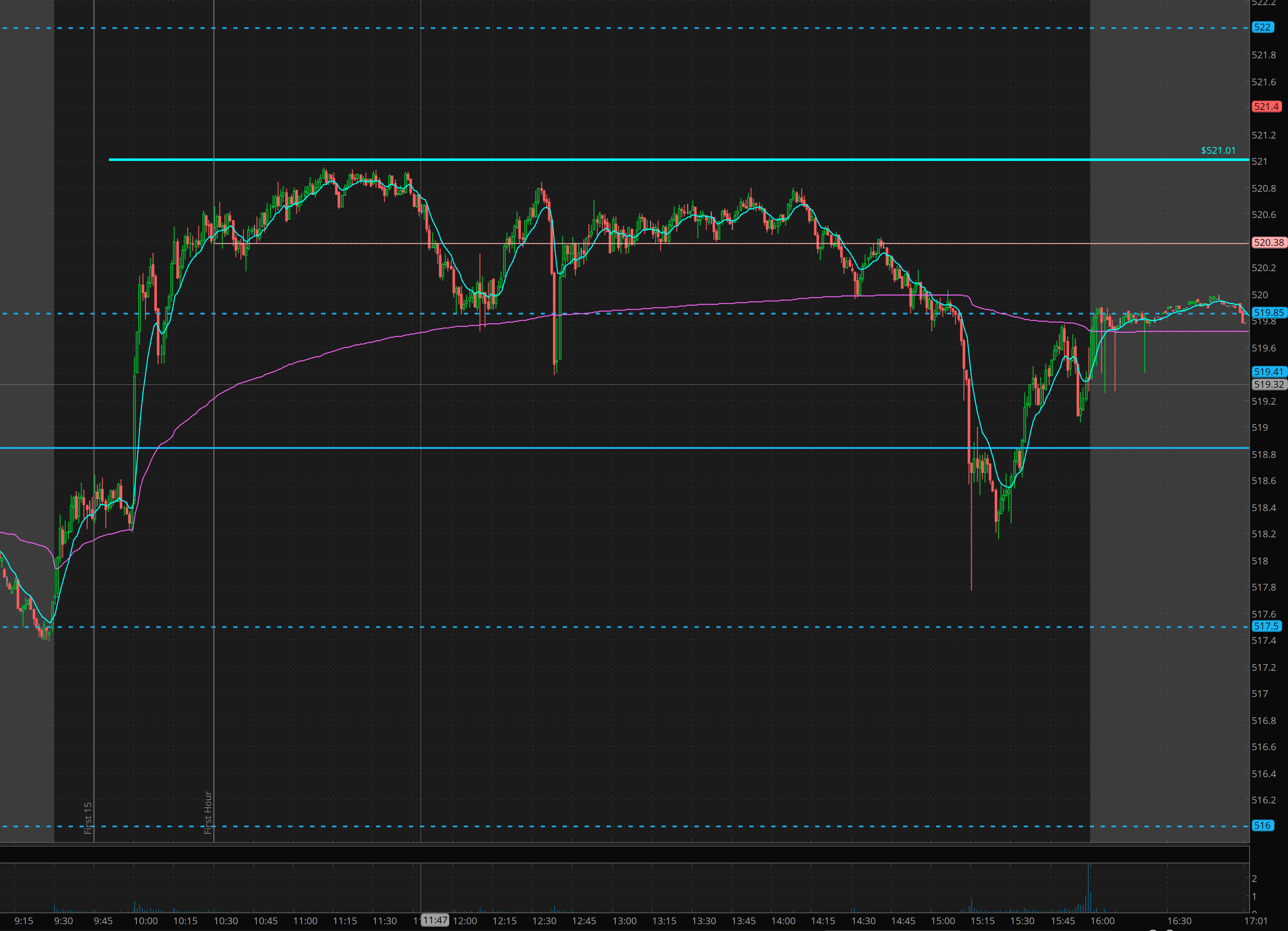 Instead we push and topped out just shy of 521. SPY then spent the rest of the day consolidating. During Powell’s speech we got an opportunity to reload between 4 and 6 but the pushes only got to 10 and I wasn’t getting the $12 sell targets so trailing stops stopped me out for small gains.