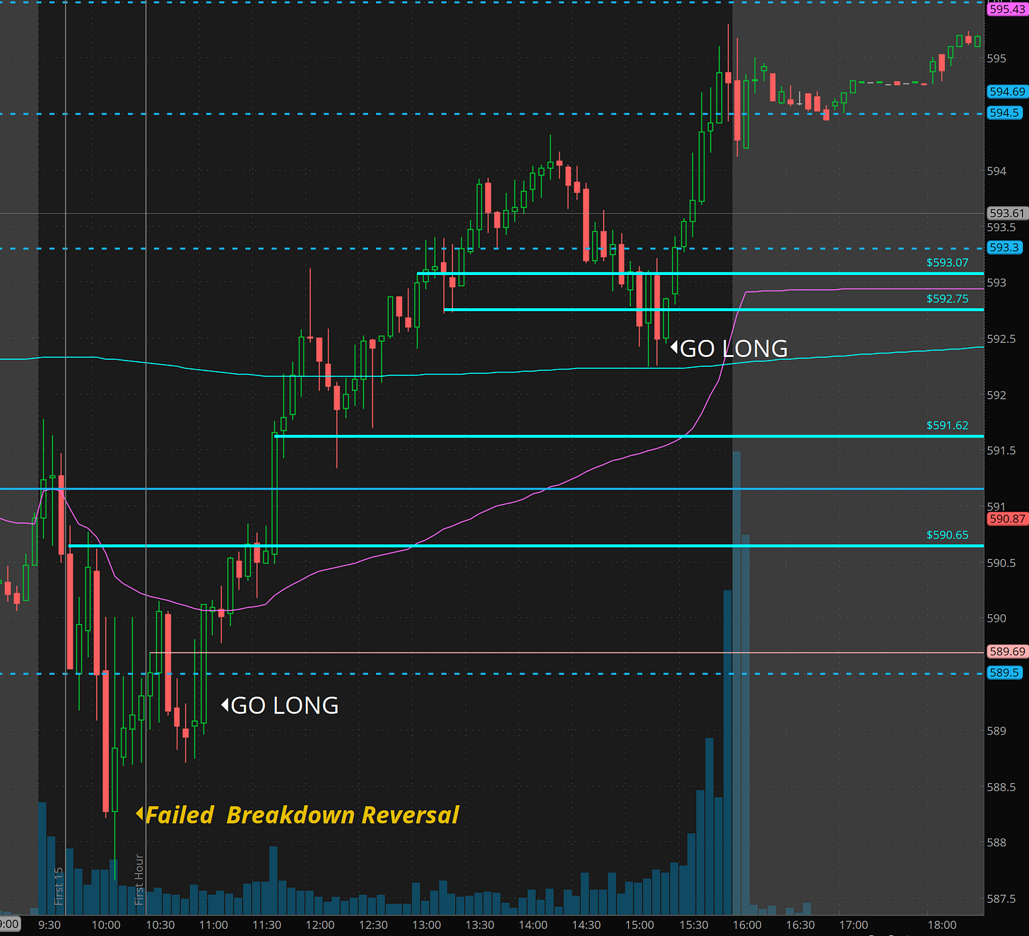 Yesterday I was looking for day 2 upside move and we got it. We planned for the dip and targeted SPY 593 and then 595.50 for the close.