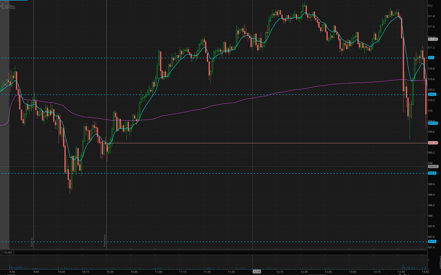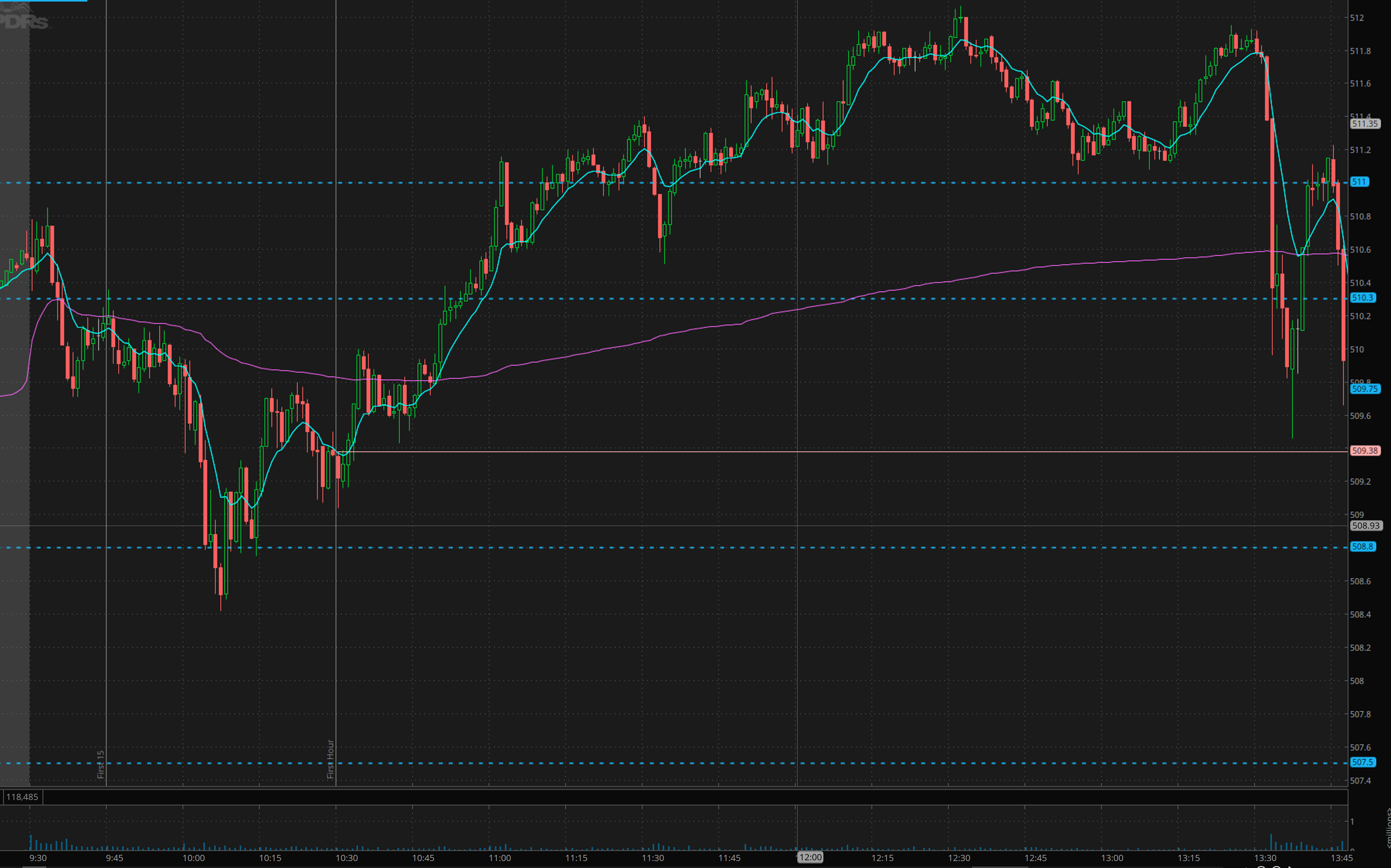 Given the market gap up I wanted some gap fill before pushing higher. and a expected a little overshoot on a dip past the 508.80 level into 508.50 for a failed break down reversal setup there.
