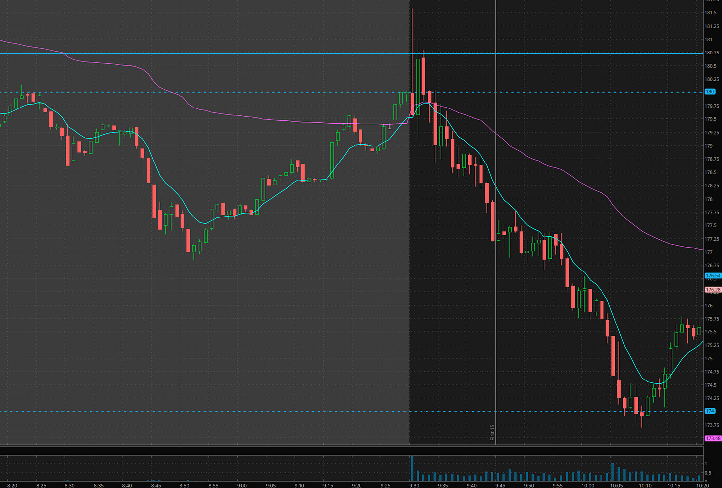 Notice the premarket action beig so weak, so I made the plan that if we get to the solid blue line at the open I will go short targeting 174 or less.