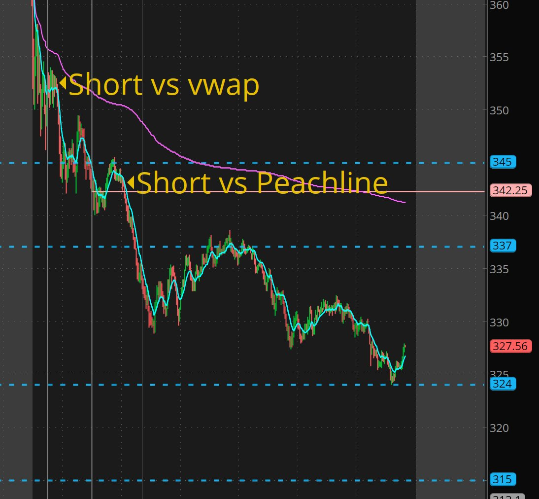 Instead of getting a push up into the level above and then targeting 2 levels down which gives us 345 and 337 as likely targets we started selling out of the gate. so I then assume 345 is going to break and target the 2 levels below so that is 337 and 324. It’s that simple. Don’t over complicate things, the levels I share work more often than they do not. My levels come from a combination of math and intuition.