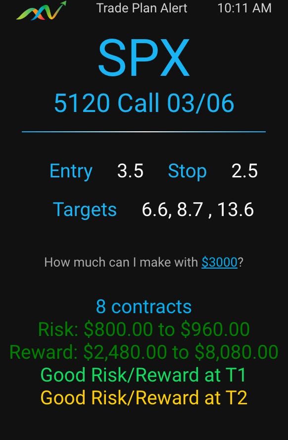 Mar 6 - SPX 5120c Entry $3.50 - High after $12+ ($3500→ $12000 potential)