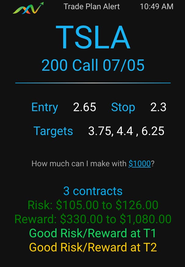 June 26 - TSLA 200c 7/5 swing $2.65 —> ($2650—> $4500 potential so far could hit $15000+)
