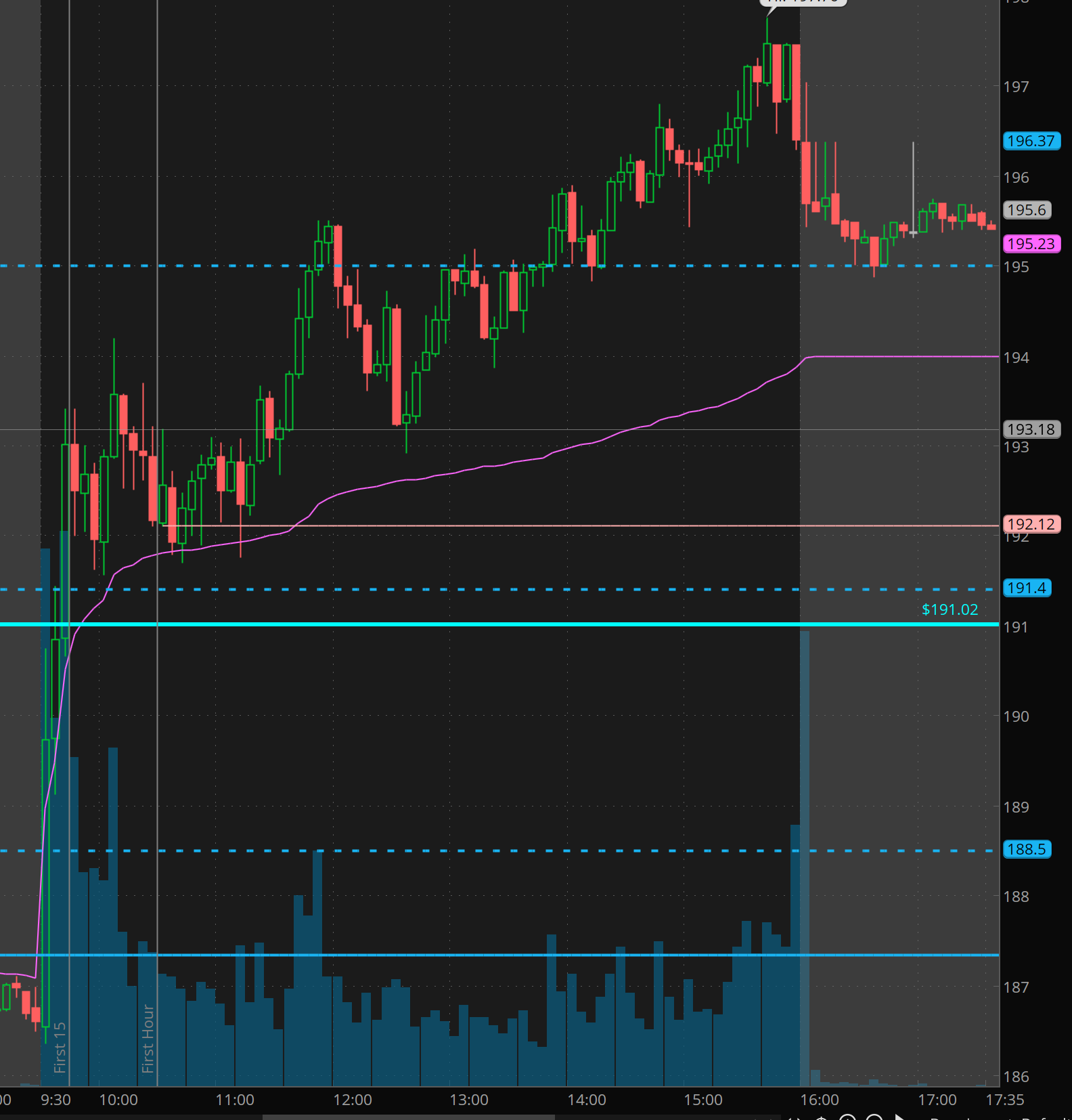 In the first 10minutes the 190.70 level and 191.40 level got a range break. so we then wait and see if vwap holds. It did and I generated this trade plan in Edge Trade Planner