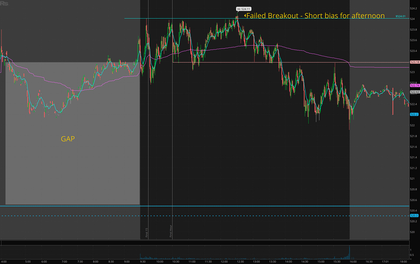 The primary trade I wanted on SPY was a short of the level above. or a long after a gap fill or a failed breakdown reversal at 522. None of my levels were met yesterday and so there wasn’t one of my normal trades to be had. So I skipped trading SPY until after lunch.