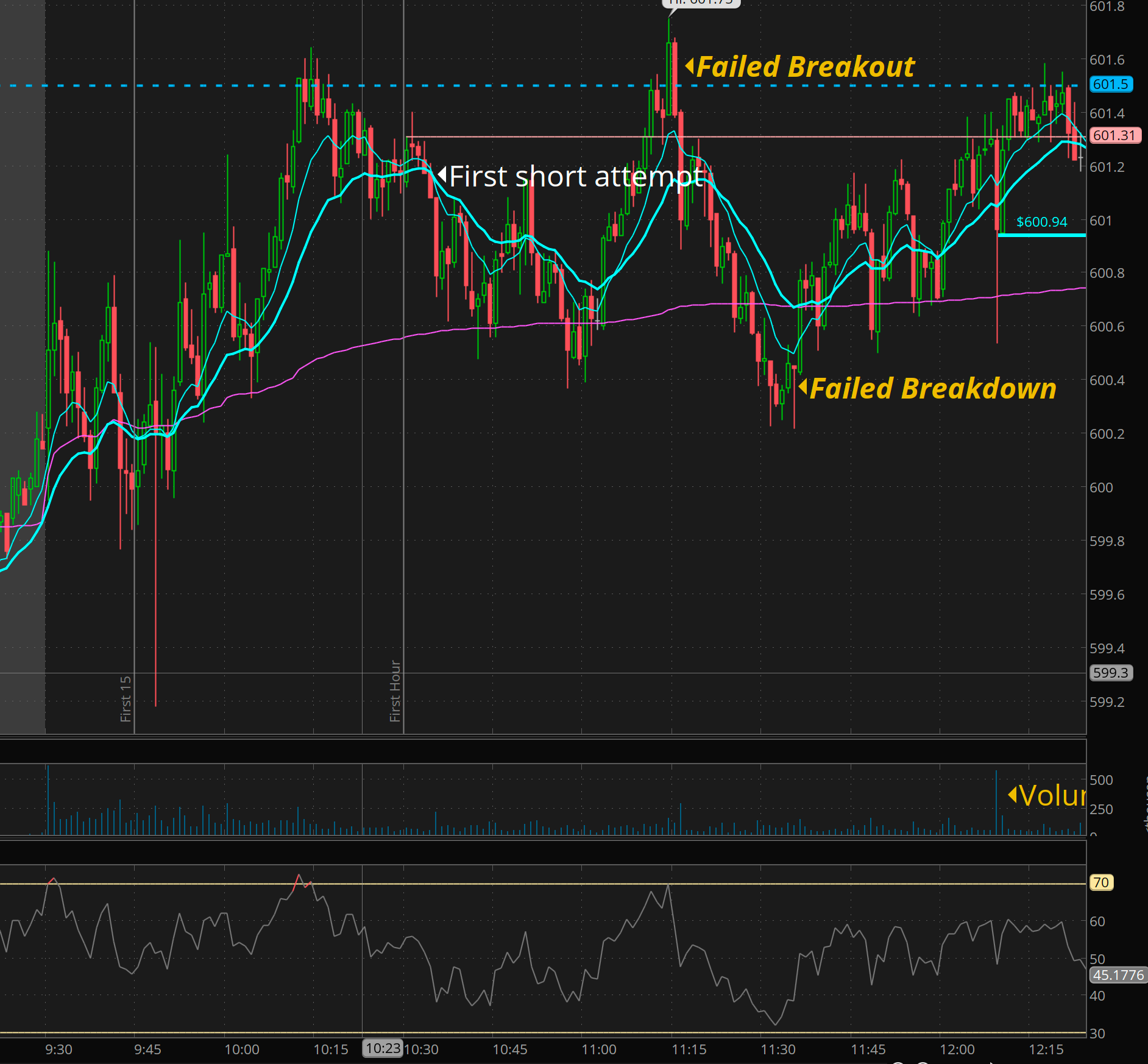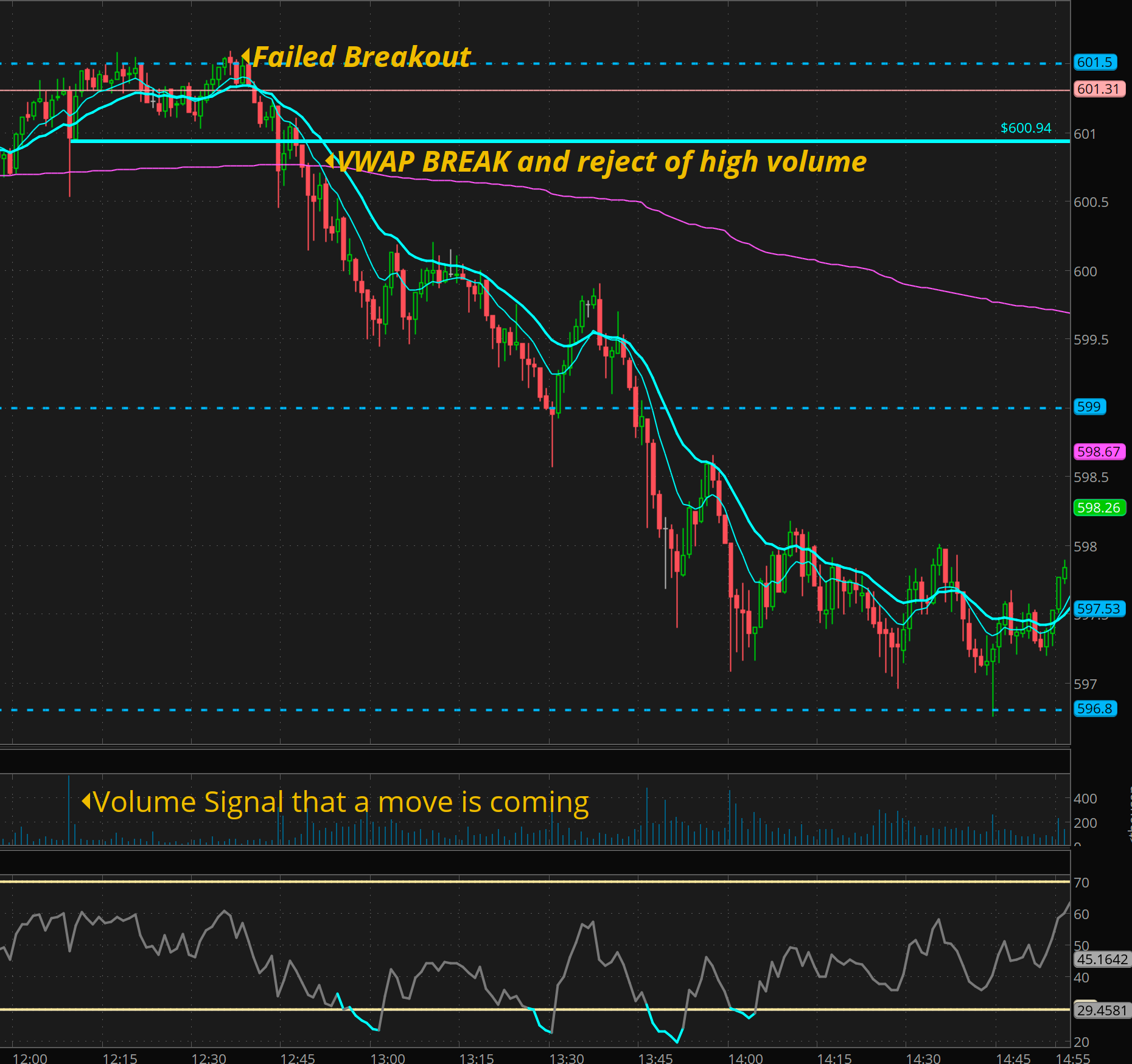 So here is the analysis. During lunch we had a large volume signal come in. We then got 601.50 rejected again, followed by a vwap break, and back test of the high volume level and draw my the solid cyan blue line.