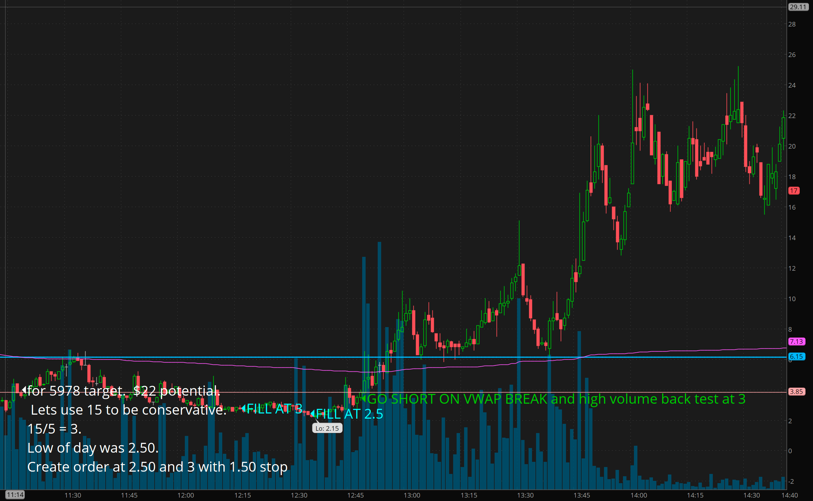 The second method requires active monitoring until I can create an algo to look for these conditions and alert me. There was a 4 minute window from time of high volume level break and vwap break to take action and enter at the “right” time for insane risk/reward.