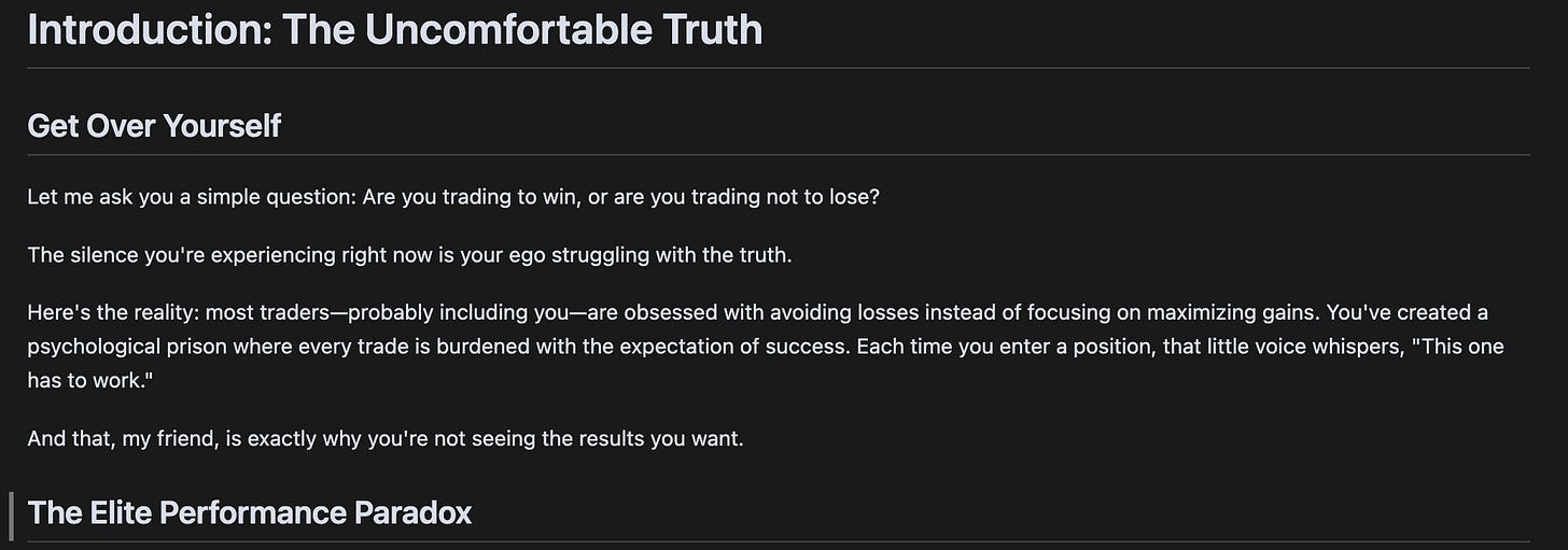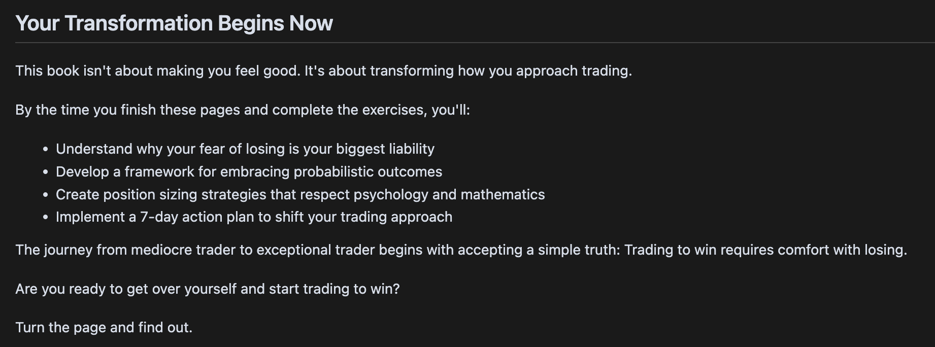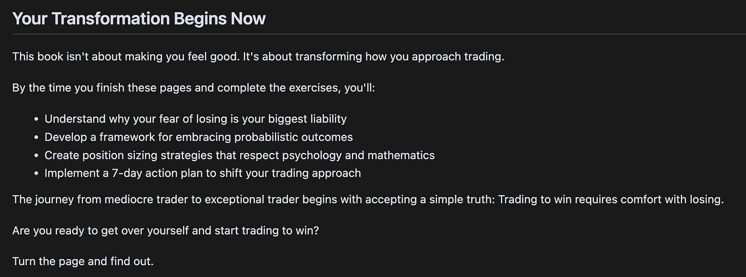 Keep an eye out. I’ll be publishing a book called Trading To Win: Stop trading to NOT lose. Title is still in the works. I plan to include exercises to help you improve your mindset and your trading. Leave a comment or send me a message if interested in the book.