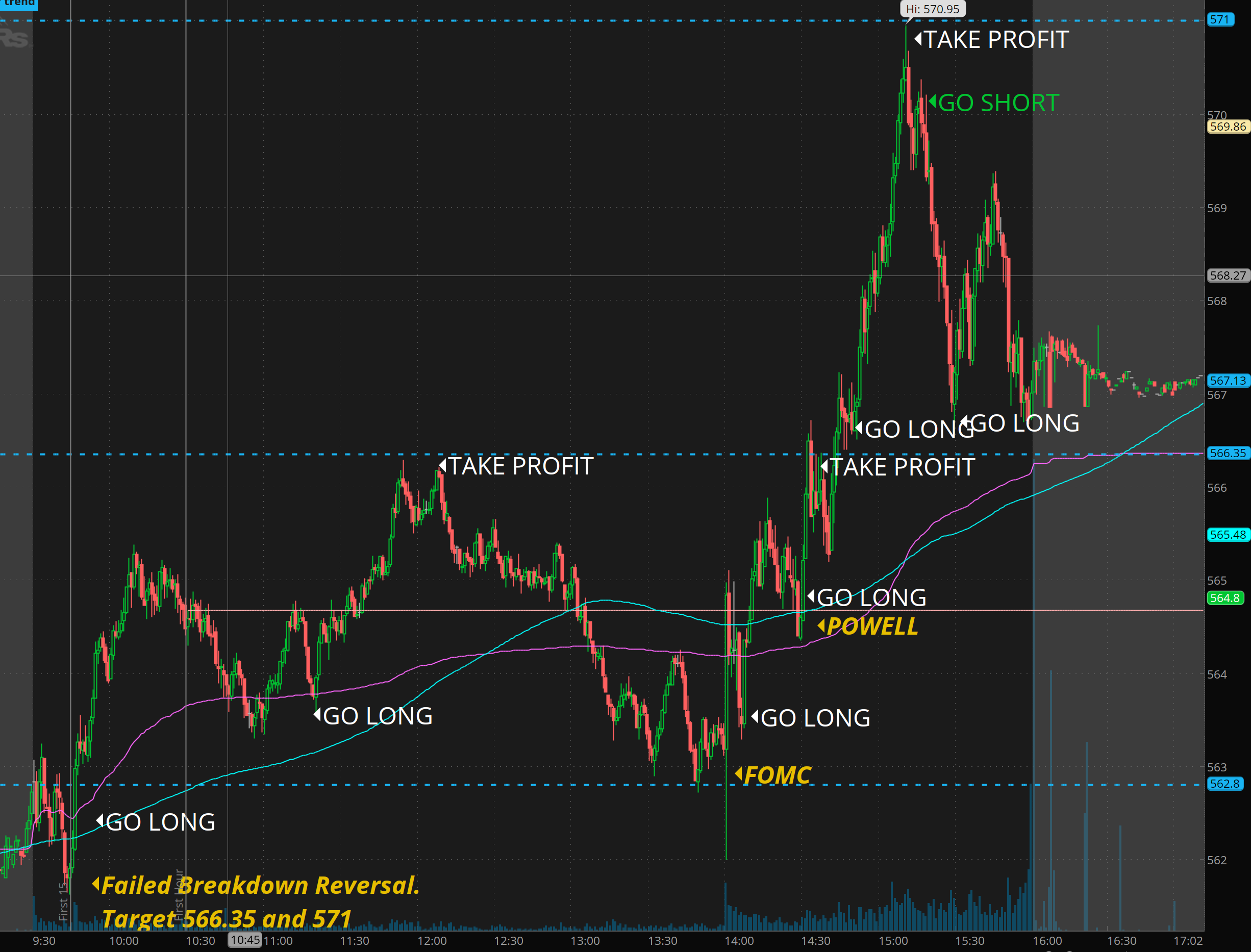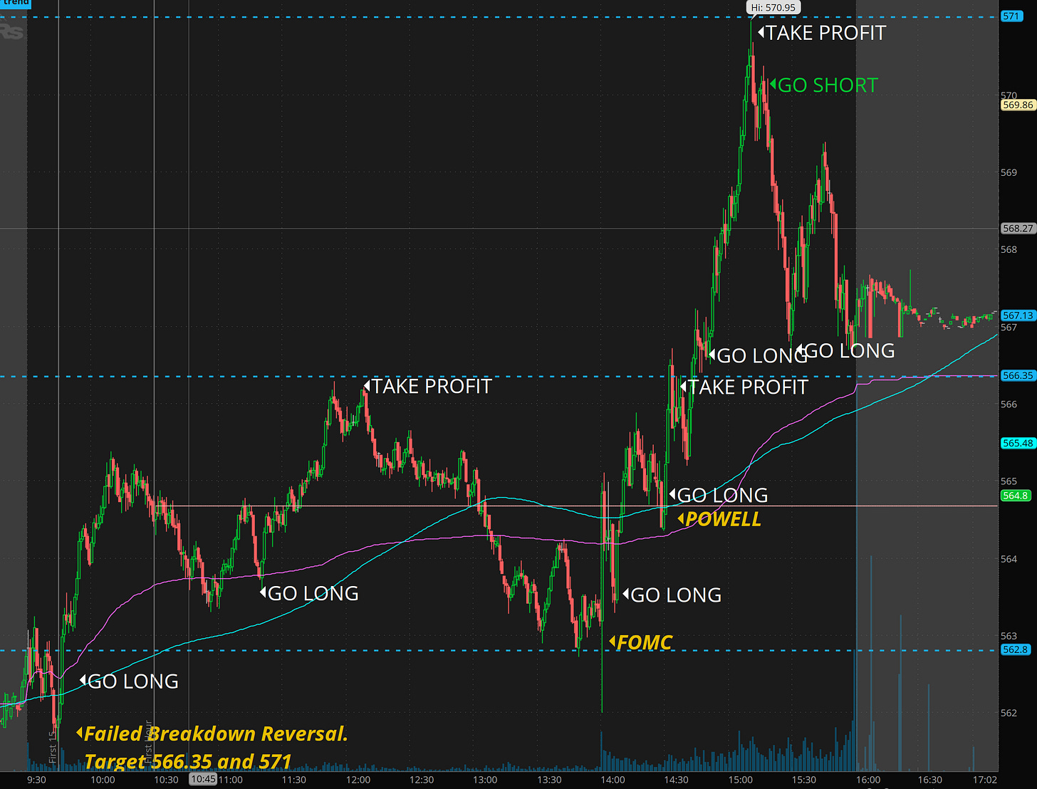 FOMC squeezes SPY back to 570 but it could not keep it. Trade Ideas for Thu Mar 20