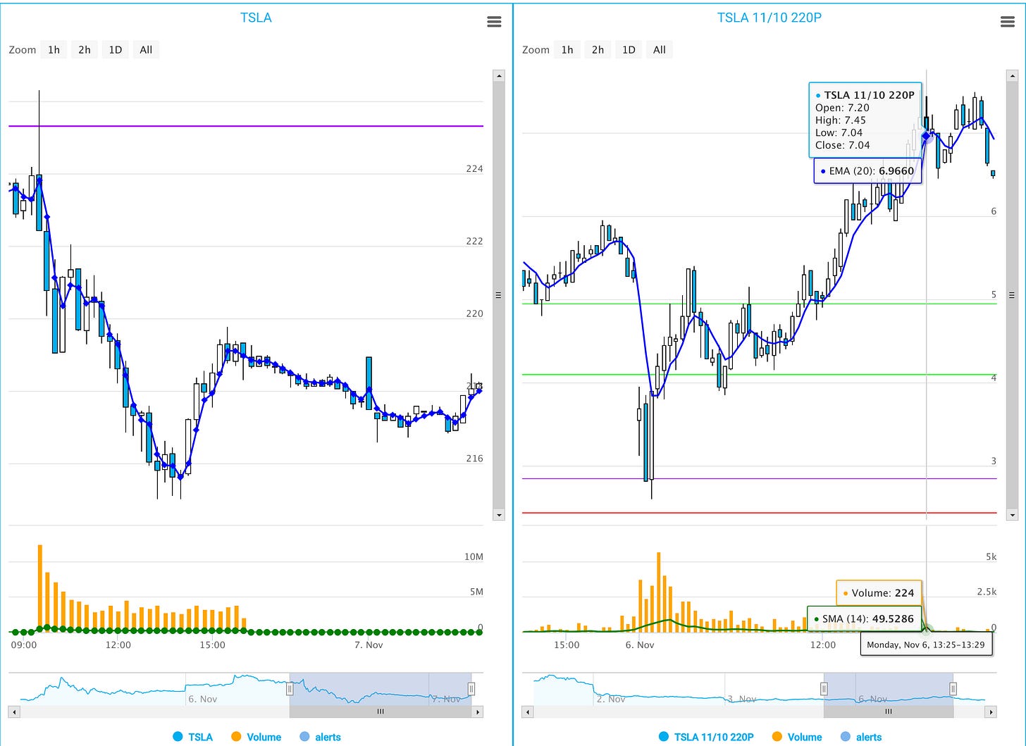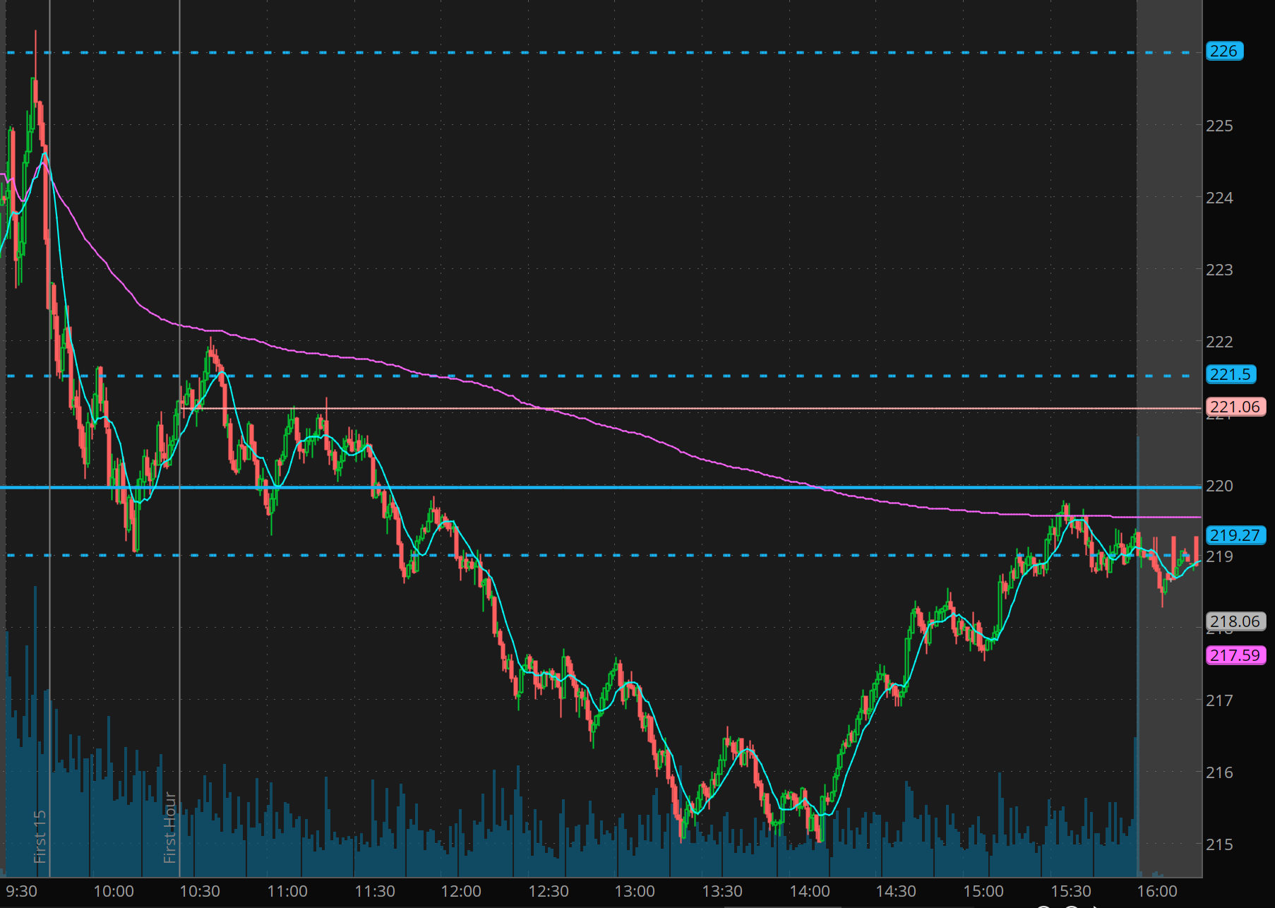 When we hit 219 I locked in the majority. The super interesting thing is if you slept in and came after the first hour, you can see how TSLA rejected the 221.50 level. and around 11am it kept rejecting the peach line and we got additionally buying on 215 puts. This would be where one can reload and/or start another short.