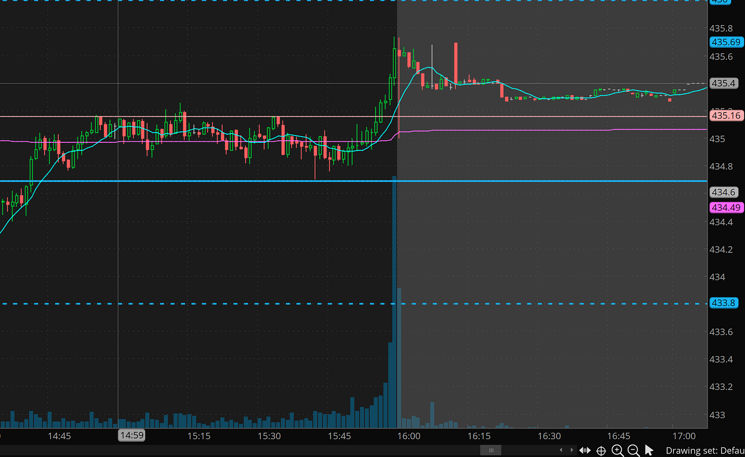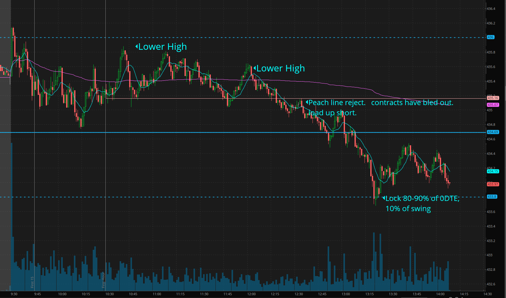 I wanted more but given the way we dropped and you can see the heavy volume as soon as we hit my 433.80 level, I locked in majority. I assumed there would be a backtest 434.70 before more downside would come. Instead. 434.70 reclaimed after making a double bottom on 433.80. That where my first warning bell went off on the market may squeeze / rip into close and the rally may not be done.
