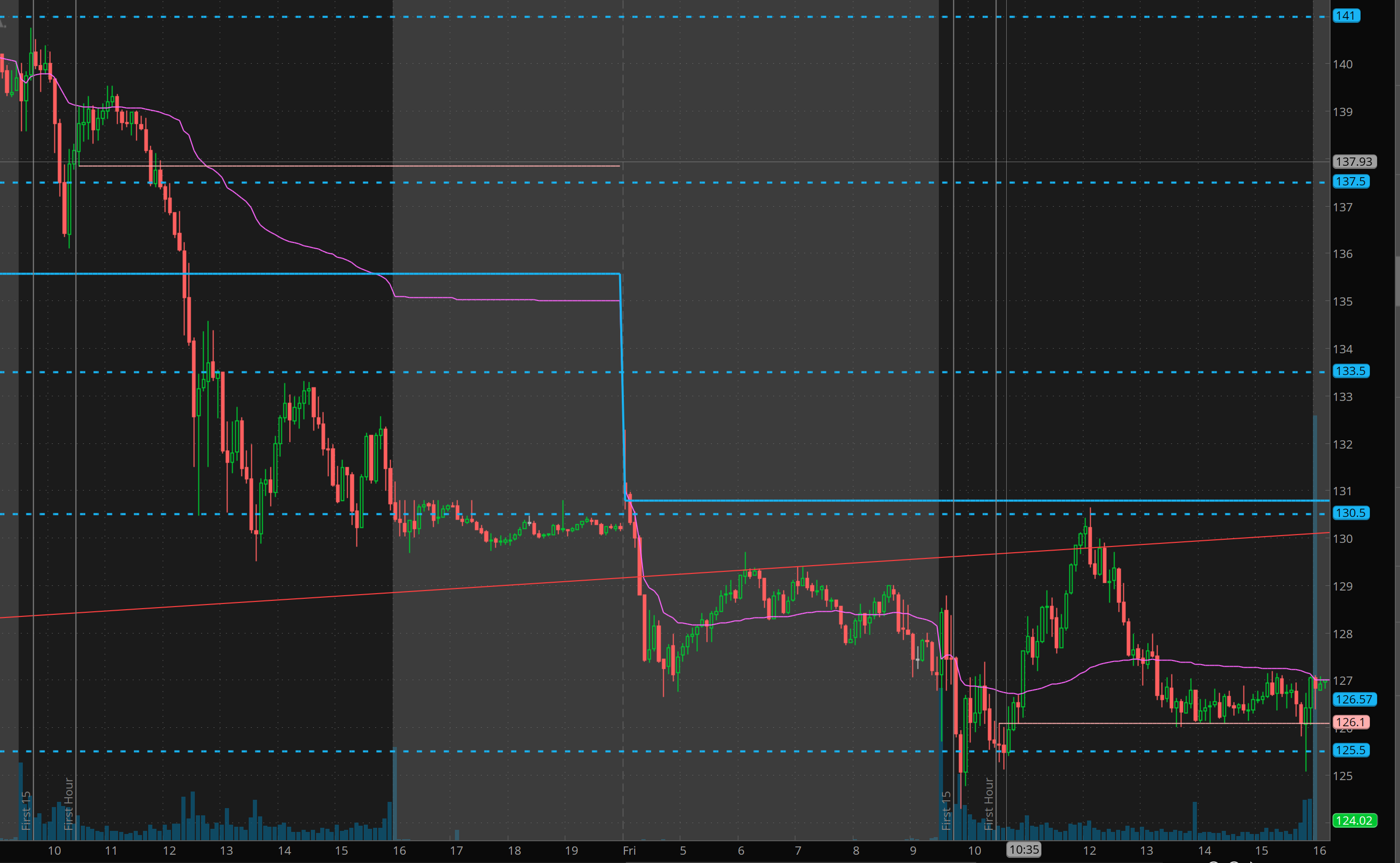 Coming back after the first hour was great 2. We had a 2 level gap down into 125.50 and a double bottom. Perfect gap down reversal setup. I ended up chasing some 129 calls on vwap reclaim targeting 130-130.50 and took profits along the way and then flipped using 129p once 130 was rejected after 12pm. Guess what. 12pm was when the selling began in earnest on Thursday so I though they may do the same thing on Friday. We got a nice clean dump into the 10:30 (pink level) at 126. Not bad!