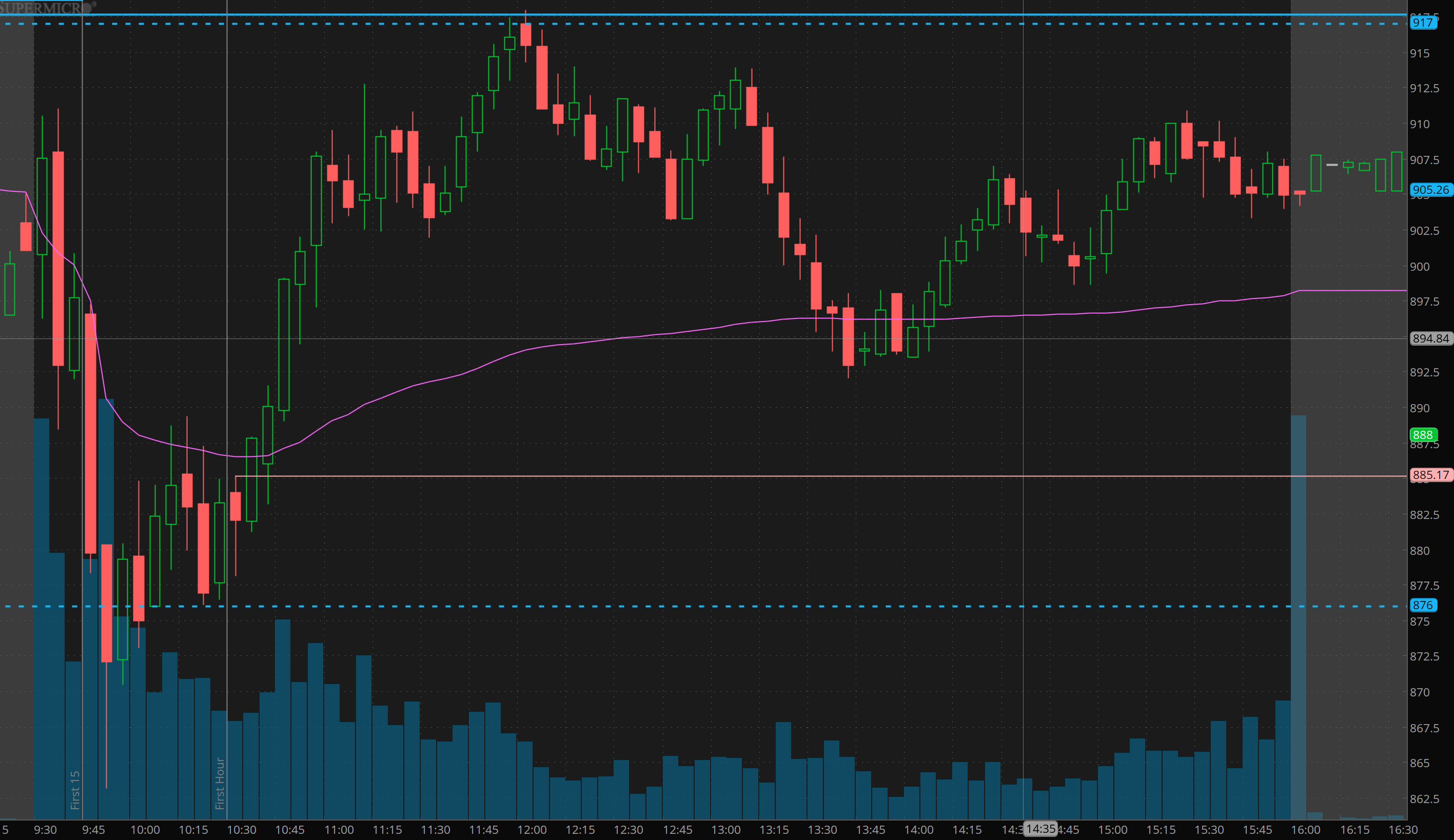 I’m super proud of my trade on this. We had a large one level drop right to the 875 level. We then got higher low/double bottom on 875 and then reclaim of vwap after 10:30. My target was 910-920. It ran perfectly to fill the gap at 917 for the final exit on the longs. Net result. SMCI 905c went from 4 to 12!