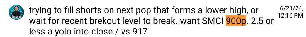 However with SPY we got an initial dip, but it didn’t get to my 542 target and only pushed to 545, missing 545.50 and filling the gap. As such there wasn’t a trade for me. Per my plan to wait the first hour I went to the gym at 8:45am and returned to my desk around 10:30 to see what was developing. I waited until noon to consider puts after the 545/opening level failed. Not a great trade setup, but a fair one. Overall with quad watching and the gap down, one has to be more patient and accept if there isn’t a great setup don’t take. I chose to focus my energy on NVDA and SMCI.