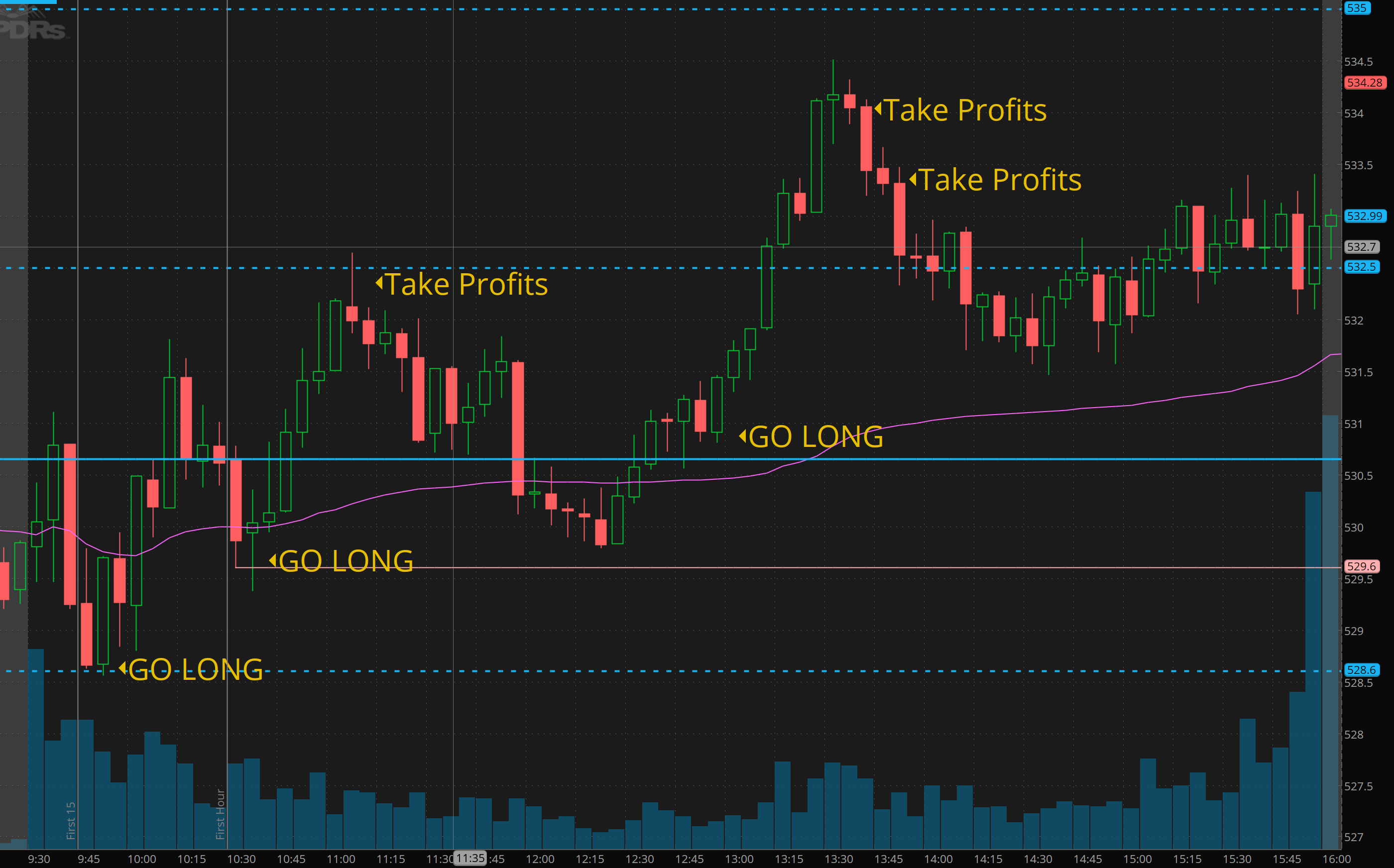 On Friday I wrote, that 528.50 needed to hold, we dipped right there on the open to get long. And took profits into the spikes above and push into 532.50. It happened to fast to alert the entry unfortunately, but that is why I tech and share process. Many time members enter at better prices than I do.