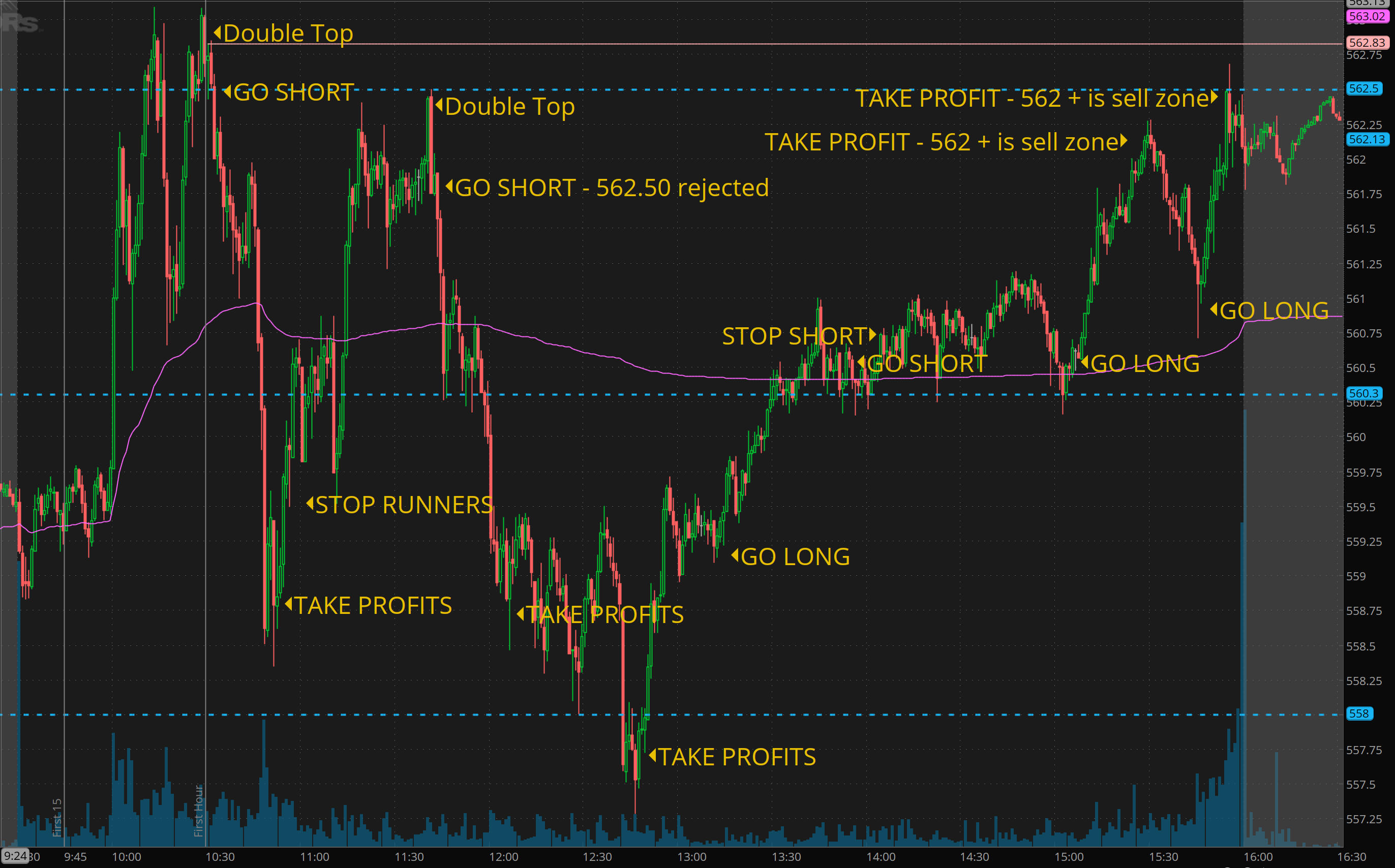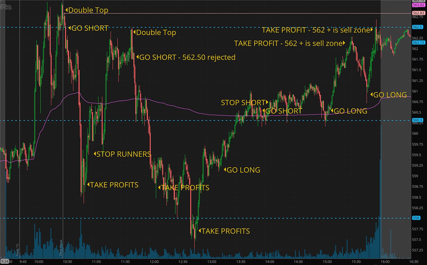 Notice that I attempted a short around vwap at 2pm because of my short bias after Powell’s speech and quickly got stopped out. That is OK. I got short because of what looked like a failed push with a starter anticipating vwap break for adds and it quick reversed turning into support. At this point, I started assuming round 3pm we could rip back on 562.50 and maybe squeeze higher.