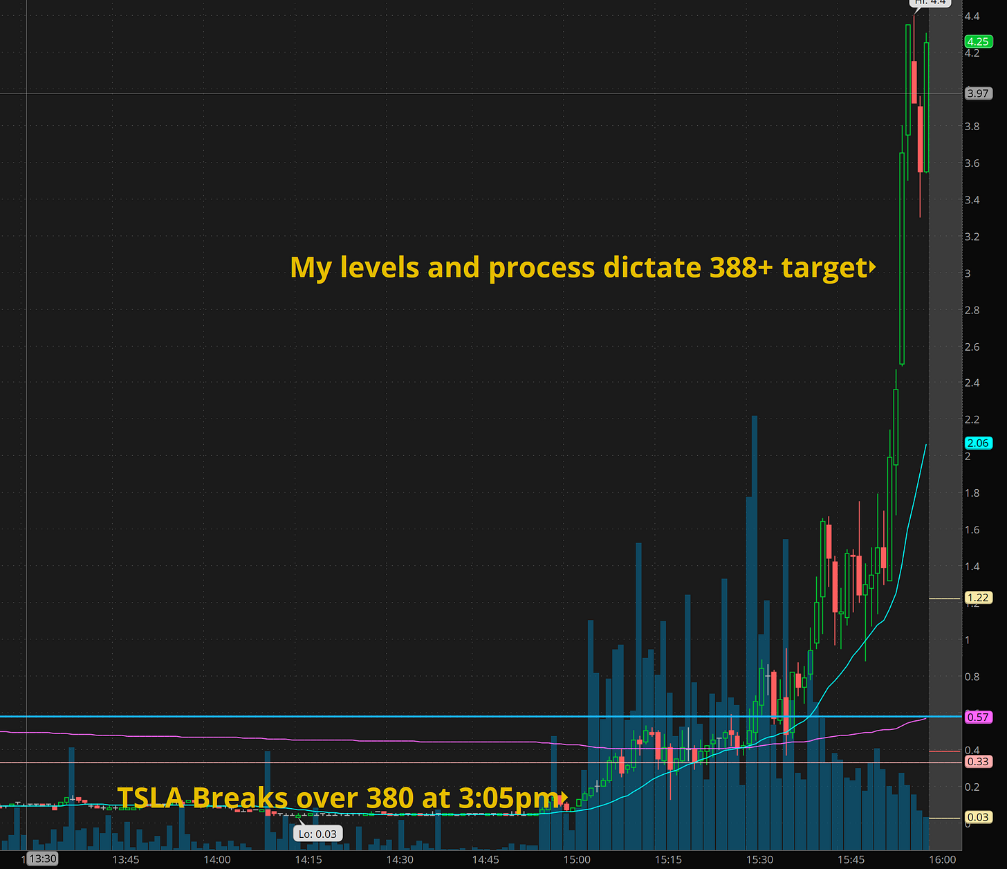 Here is what not following process EVERY TIME cost me by not taking action even doing a small $2000 bet. I saw TSLA approach 380… and clear. My levels say 388+ coming.