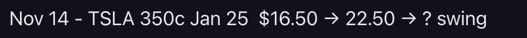 Nov 14 - TSLA 350c Jan 25 $16.50 → 22.50 → ? swing