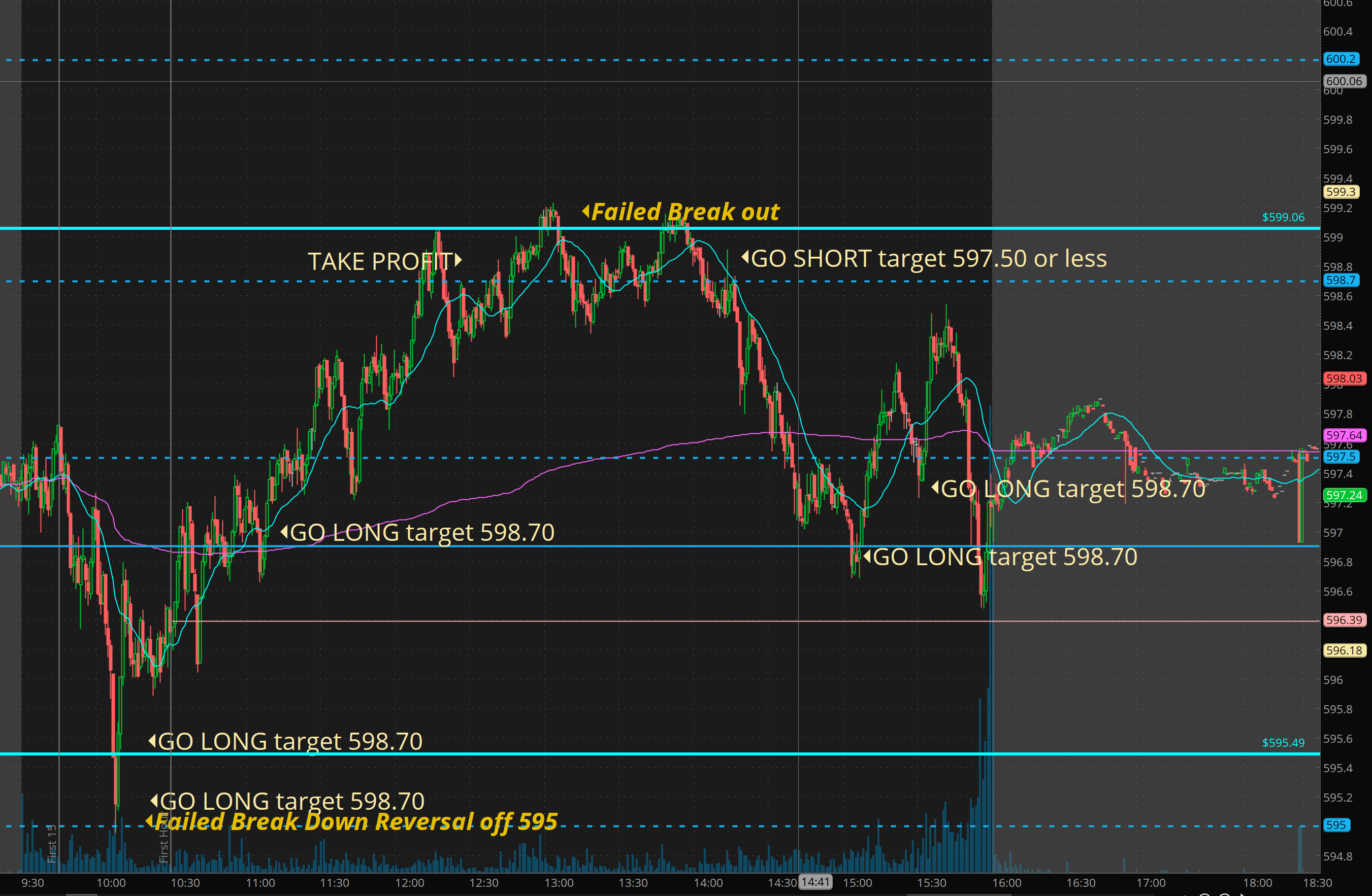 SPY - tight consolidation day with a fast dip into 595 and then pop back into 599. Follow the levels really well. We secured a nice short in the afternoon and 2 10 baggers to the upside as well.