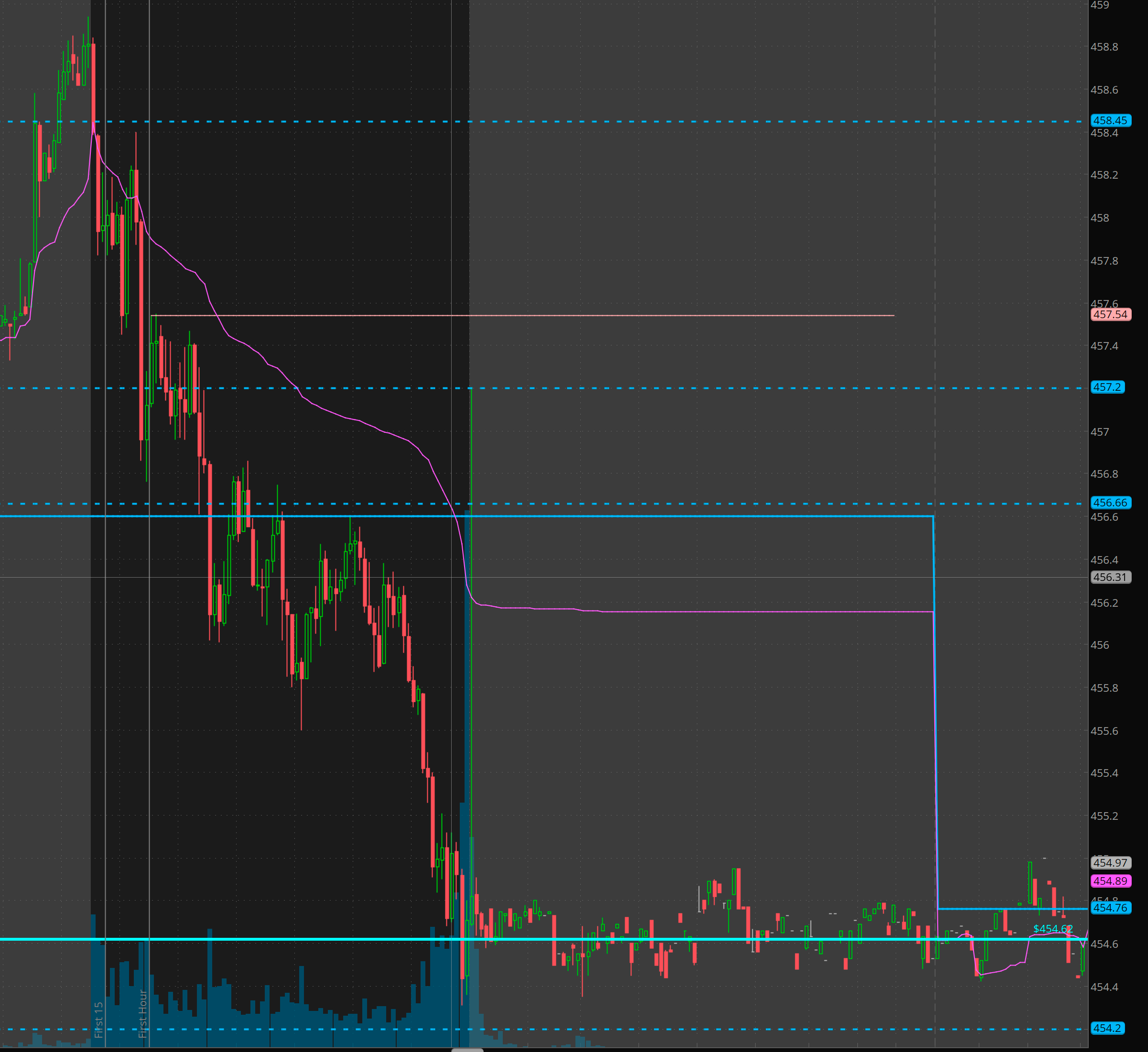The gap up reversal and fail off 459, was a no brainer short. and it paid quickly. The major question in my mind, and where I went wrong was I was expecting SPY 457.20 to hold and start a grind higher. We had what appeared to be a failed breakdown under 457.20 and then a reclaim over after the first hour. So took starter long and plan was to add once over vwap. That didn’t develop.