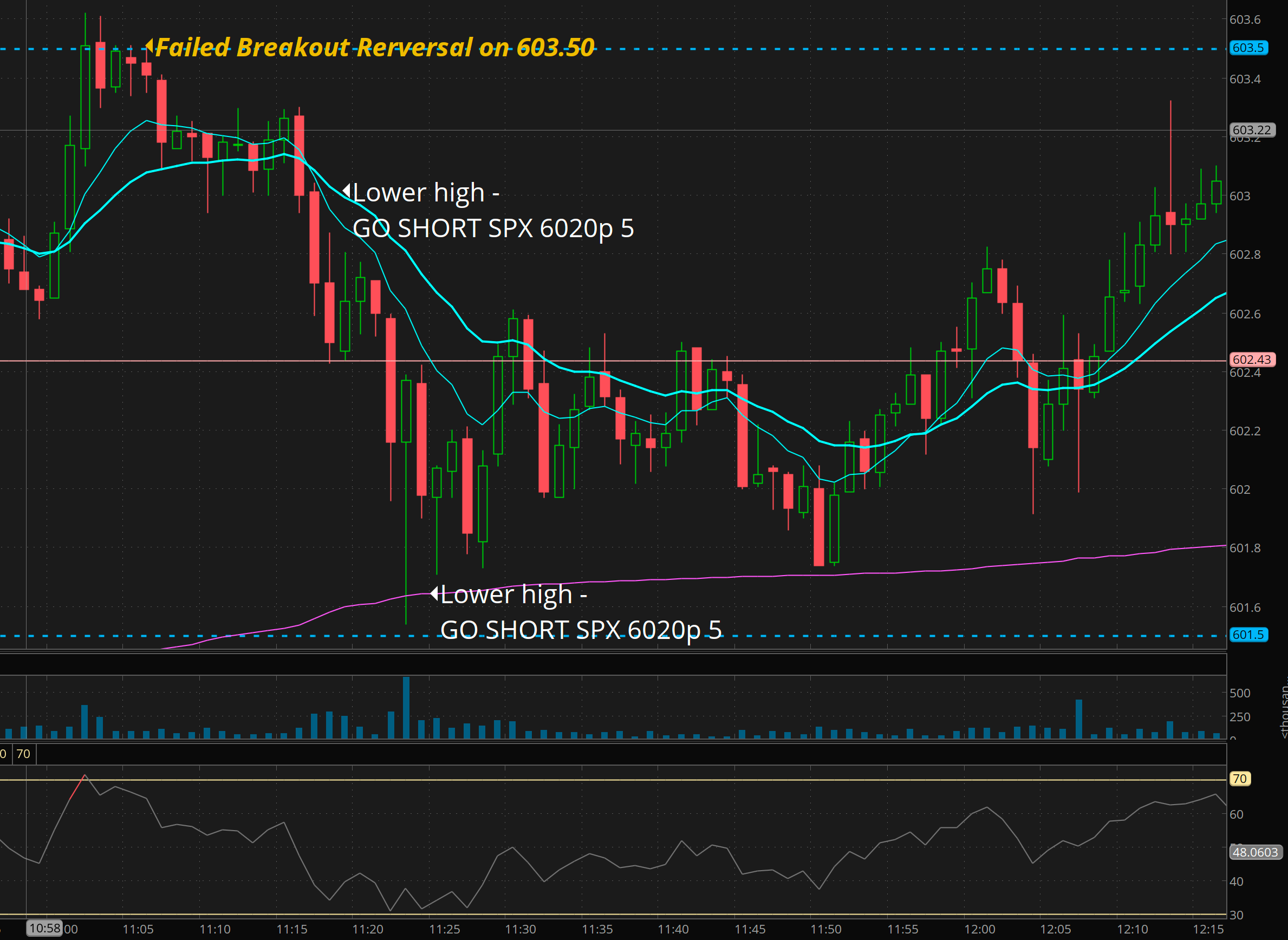 Having missed the long I had to wait for 603.50 to come. I started in early got stopped and then waited for the actual confirmation and reentered. It was essentially a 100% payer trade, but it was $5R! A high probable trade. Why? 2 Level move from open and RSI Divergence on the rejection.