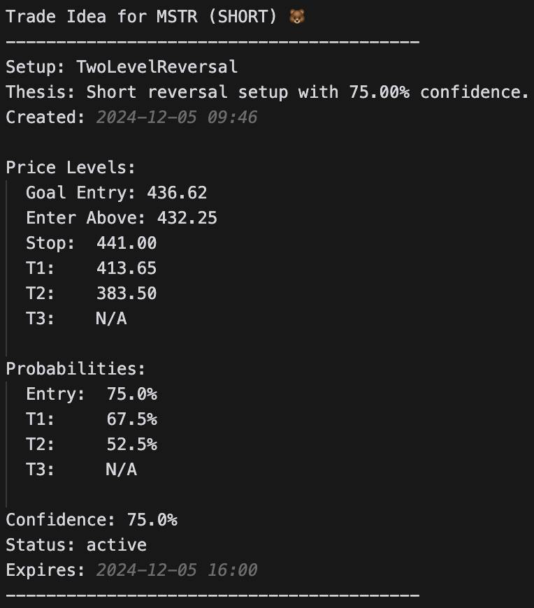 In this one, I need to analyze more. I was targeting 395, and yet the algo chose 383.50 for T2 and the low turned out to be 373. That said the fact it identified 50 points to capture out of 70 point move is amazing while waiting for confirmation signals. The first warning of potential short entry came 10 points higher. at 442. so I need to figure out when to share these heads ups vs them being too much noise.