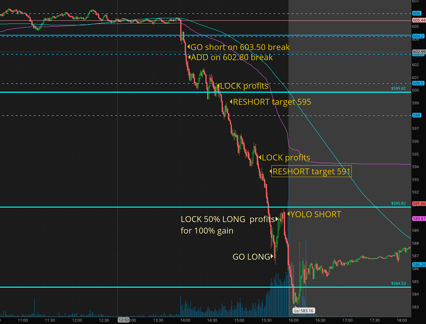 SPY - broke all major levels I had. 601, 595, 591, 585! but 585 turned into support after hours.