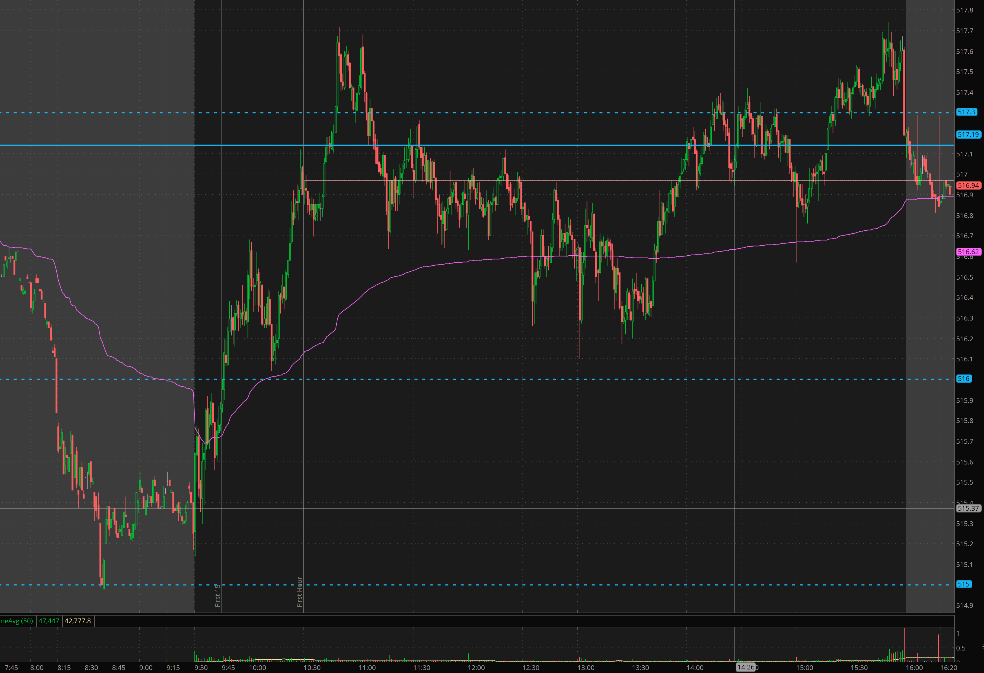 In premarket we got the 515 level test and a quick dip and rally started trigger a run for the first hour and getting the gap fill I wanted. We then were able to get short on the double top and then had to wait. Lock some in per plans on the flushes, but the dips under vwap kept getting bought. After the 3rd dip after lunch seeing 516.20 hold, I became convince we would retest 517.30 and maybe high of day and that is more or less what happened.