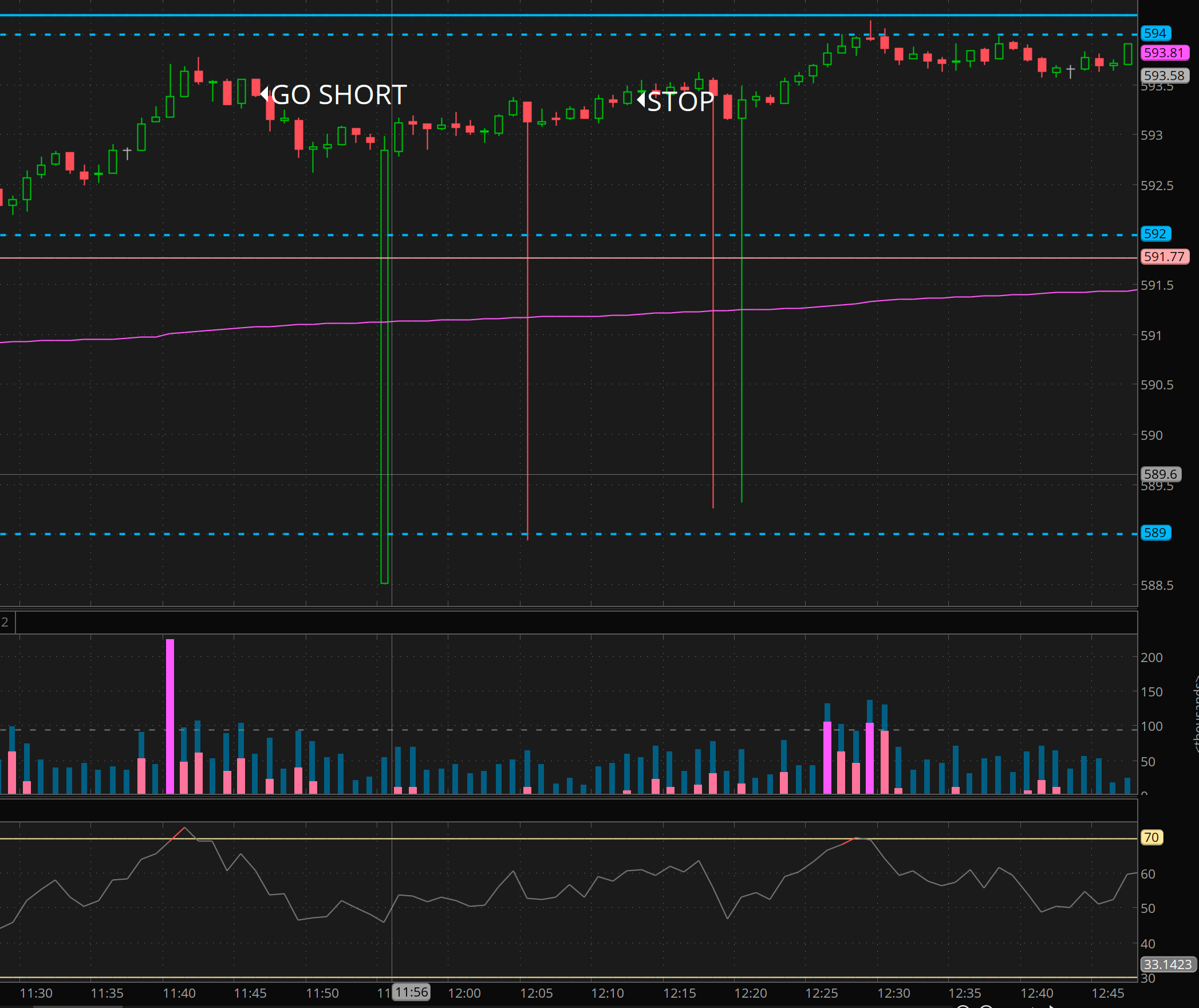 We had a lower high on RSI + SPY made a new high. I alerted to members that I was looking for a failed push on 593.50 since I have noticed that selling in the past would sometimes trigger trigger $1 below previous day high. So I took a short saying I will stay in this as long we stay under 593.30. Well 593.30 was claimed again I cut the trade for a small loss.