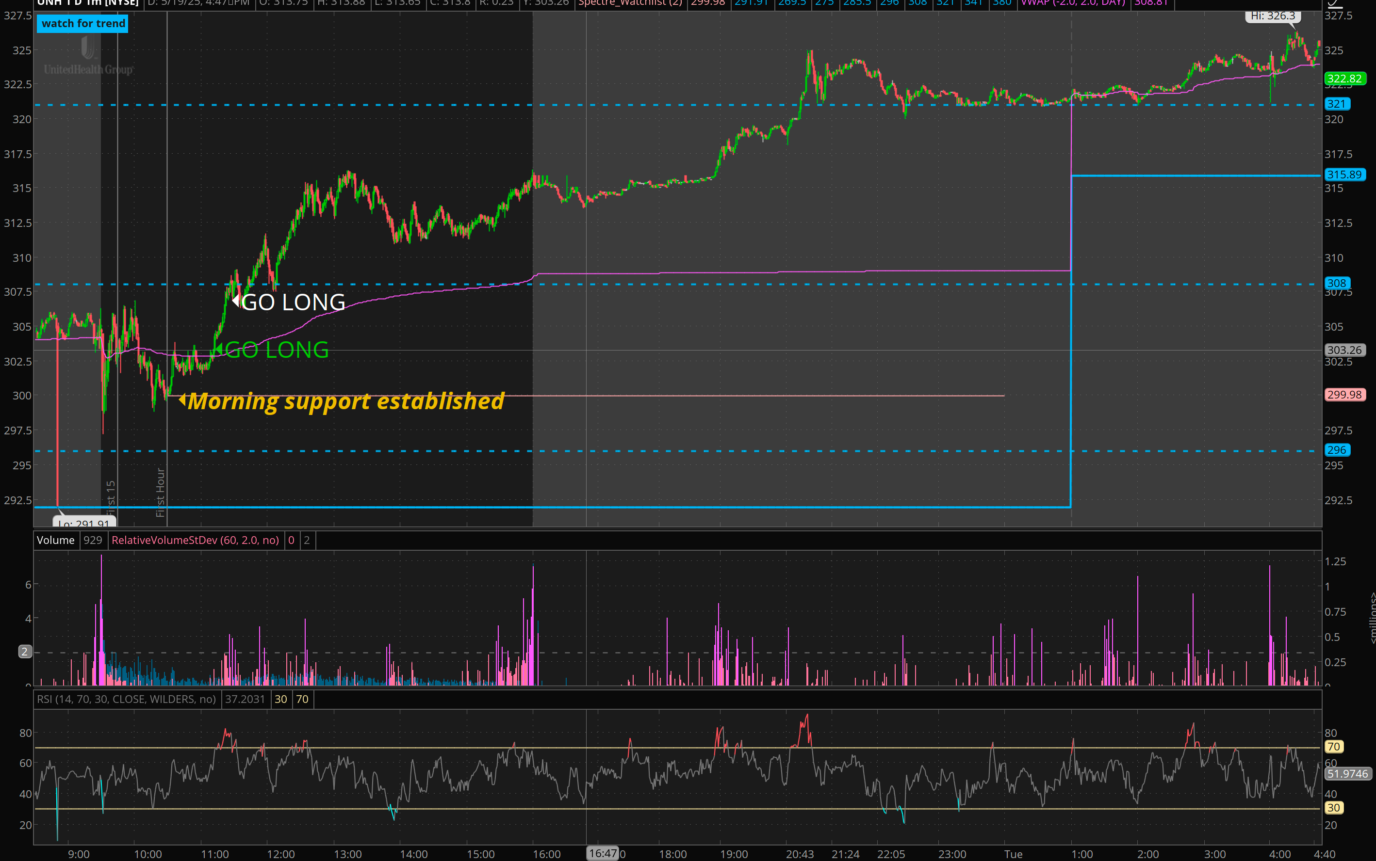 Trigger: morning support established and will break out over morning highs
